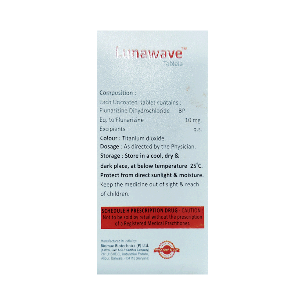 Lunawave Tablet is a medicine used for the prevention of migraines. However, it cannot treat an acute attack and will only work to prevent migraines for as long as you continue to take the medicine. This medicine relaxes the brain, preventing migraine headaches. Lunawave Tablet may be taken with or without food. However, it is advised to take it at the same time each day, as this helps maintain a consistent level of medicine in the body. Do not skip any doses, and finish the full course of treatment even if you feel better. If you have missed a dose, take it as soon as you remember. You should continue to take this medicine for as long as the doctor advises and do not stop taking it suddenly.Side effects associated with the use of Lunawave Tablet include muscle pain, fatigue, constipation, nausea, insomnia (difficulty sleeping), and a runny nose. Some other side effects that may be seen on taking this medicine are increased appetite, depression, stomach discomfort, and breast pain.Lunawave Tablet may also cause sleepiness at the beginning of your treatment, so do not drive or operate machinery until you know how this medicine affects you. It may also cause weight gain, and to prevent it, you can eat a healthy, balanced diet and exercise regularly. This medicine may cause changes in your mood, and you may feel depressed; therefore, regular monitoring of behavior is important. Pregnant or breastfeeding mothers should consult their doctor before taking this medicine.
