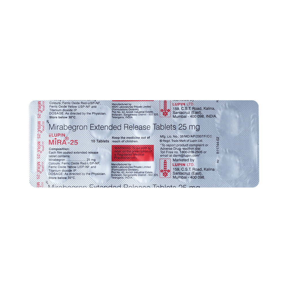 Lupin Mira 25 Tablet ER is used to treat symptoms of overactive bladder that includes increased or frequent urination, urgent need to urinate and inability to control urination. It helps to relax the muscle surrounding the bladder and increase it's ability to store urine. Lupin Mira 25 Tablet ER is advised to take it in a dose and duration as per prescription. It can be taken with or without food. Swallow the medicine as a whole without crushing or chewing it. You should not stop taking the medicine without consulting the doctor as it may lead to the worsening of your symptoms. The course of the treatment should be completed for better efficacy of the medicine.Some common side effects of this medicine are constipation, headache, high blood pressure, nasal inflammation, urinary tract infection, rapid heartbeat, and joint pain. If any of the side effects bother you or persist, consult the doctor without delay.Before receiving the treatment, inform your doctor if you are on any medication for any other health condition. If you are pregnant or breastfeeding, tell your doctor prior to the treatment. Patients with liver or kidney disease must be cautious while receiving the prescription and they must receive regular follow-ups as per the doctor’s advice.