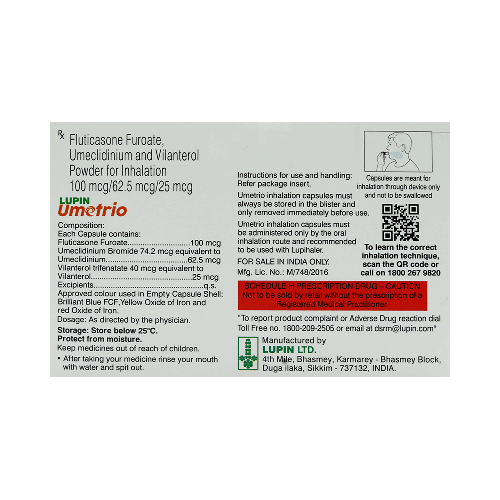 Lupin Umetrio Capsule is used in the treatment of chronic obstructive pulmonary disorder (COPD), a lung disorder in which the flow of air to the lung is blocked. It provides relief from COPD symptoms like wheezing, shortness of breath, coughing, and chest tightness. This medicine is for inhalation purposes only. Thus, it should not be taken by mouth. It is important to follow all the guidelines of the doctor before using it. Before using the medicine, the doctor will guide you on how to use this medicine. Use it in the dose and duration advised by the doctor.Common cold is the most common side effect of this medicine. You may also experience side effects like fungal infection of the mouth, infection of the nose, blocked nose, cough, and headache. If any of these side effects persist or get worse, you should let your doctor know.Do not use this medicine without consulting the doctor if you have any problems related to heart, liver, or if you have glaucoma, tuberculosis (TB), asthma, and enlarged prostate.