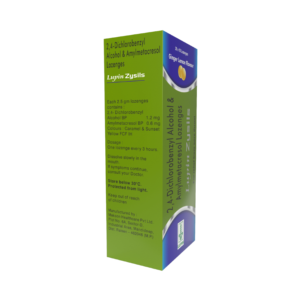 Lupin Zysils Lozenges Ginger Lemon is a combination of two medicines: Dichlorobenzyl Alcohol and Amylmetacresol. These are mild antiseptics that kill the bacteria associated with throat infections. They work by disrupting the structure of bacterial cells, preventing their growth and spread, thereby providing relief from infection and irritation.
