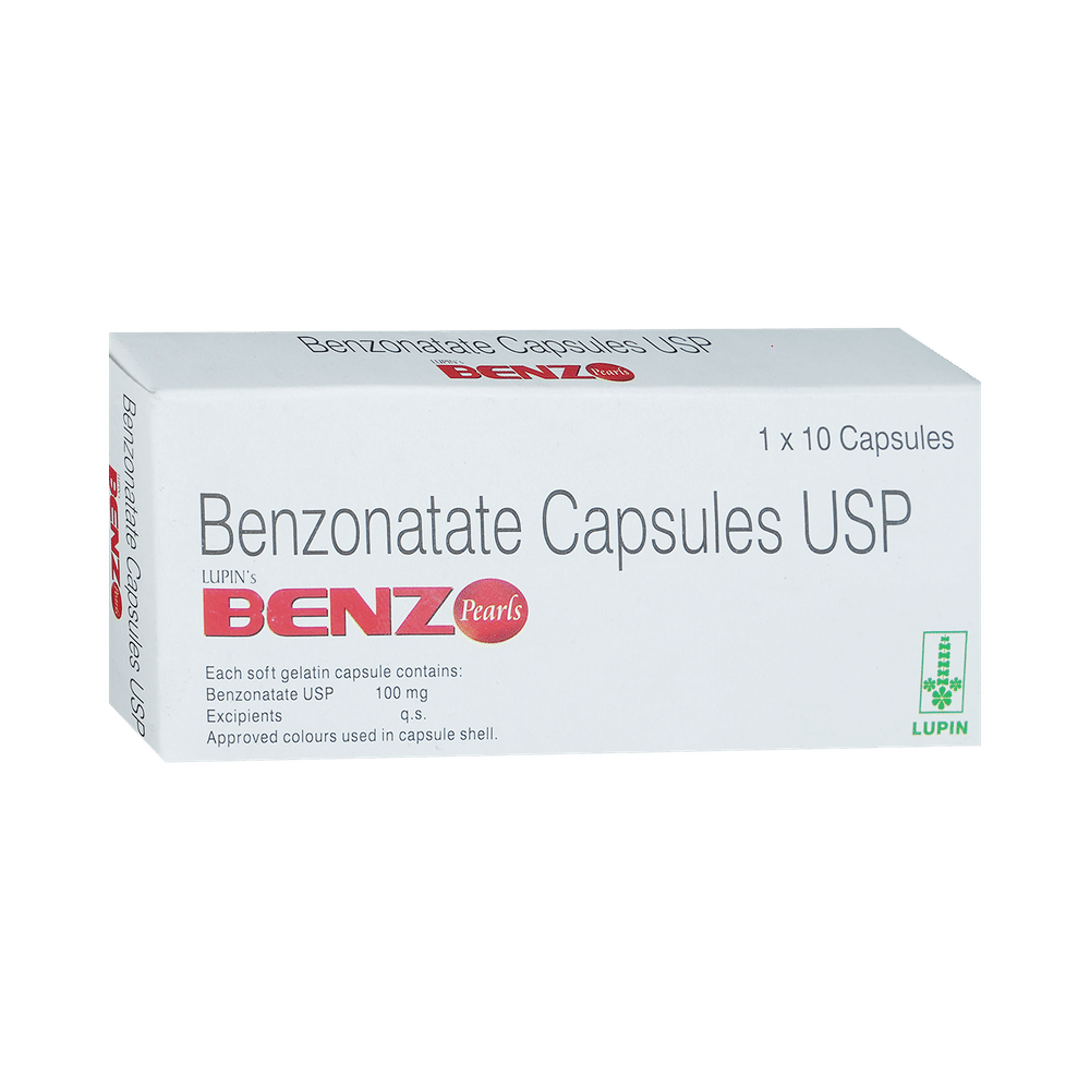 Lupin's Benz Pearls Capsule is an antitussive medicine. It is used for the treatment of dry cough. It works by suppressing the activity of the cough centre in the brain. It provides you relief from symptoms like watery eyes, sneezing, and runny nose. Lupin's Benz Pearls Capsule can be taken with or without food, but take it at the same time to get the most benefit. It should be taken as your doctor's advice. The dose and how often you take it depends on what you are taking it for. Your doctor will decide how much you need to improve your symptoms. Swallow the tablet whole with a glass of water. You should take this medicine for as long as it is prescribed for you. You must inform your doctor if symptoms do not get improved within 7 days of the treatment.The most common side effects of this medicine include vomiting, nausea, constipation, dizziness, shortness of breath or worsening preexisting breath problem, and rash. If these bother you or appear serious, let your doctor know. There may be ways of reducing or preventing them. Generally, it is advised to drink plenty of fluids while on treatment with this medicine. To overcome dizziness, avoid driving or attention-seeking activities.Before taking this medicine, let your doctor know if you are pregnant, or breastfeeding. Your doctor should also know about all other medicines you are taking as many of these may make this medicine less effective or change the way it works.