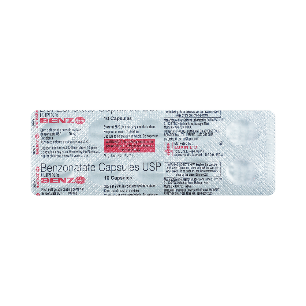 In Dry coughA dry cough, also known as non-productive cough, is a cough where no phlegm or mucus is produced. This is irritating, usually associated with a tickly throat and may be caused due to cold, flu, allergies or throat irritants. Lupin's Benz Pearls Capsule suppresses dry, hacking coughs. It will also relieve allergy symptoms like watery eyes, sneezing, runny nose or throat irritation and help you carry out your daily activities more easily.This medicine is safe and effective. Lupin's Benz Pearls Capsule usually starts to work within a few minutes and the effects can last up to several hours. Take it as prescribed by the doctor. Do not stop using it unless you are advised to by your doctor.