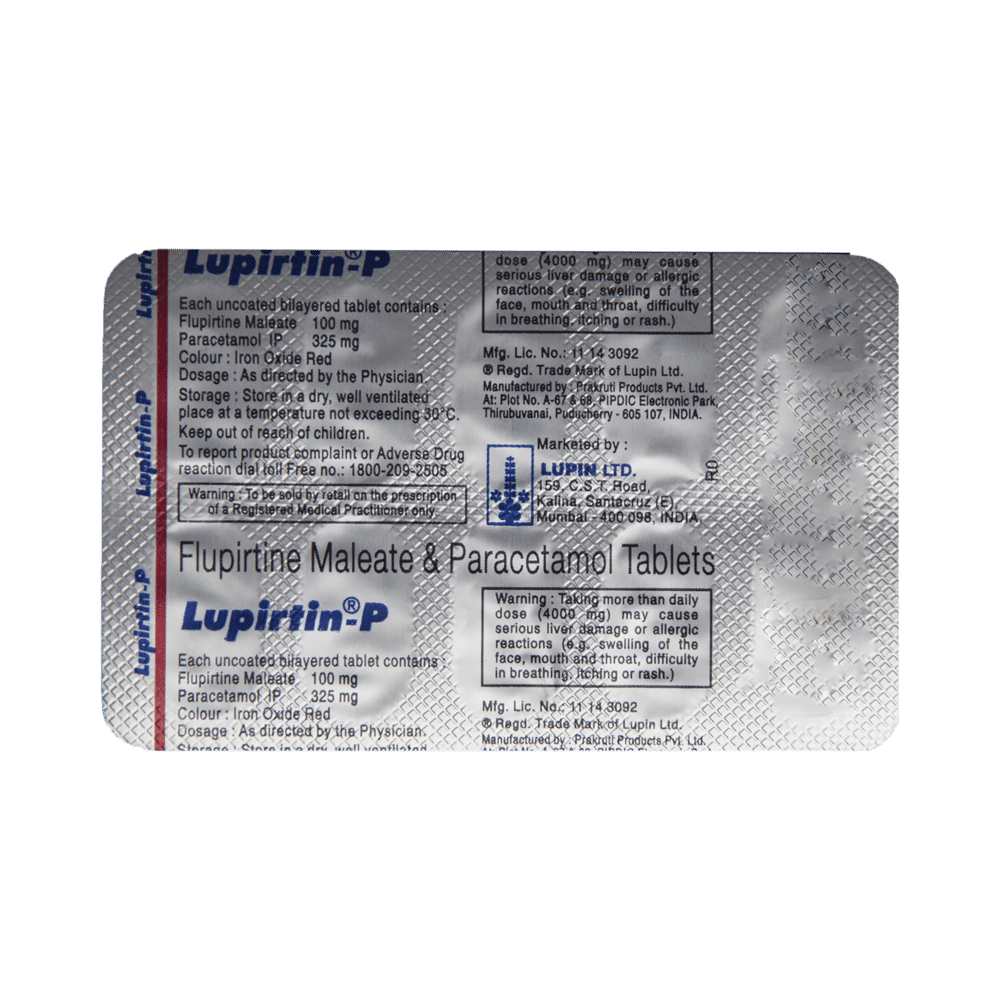 Lupirtin-P Tablet is a combination of two medicines: Flupirtine and Paracetamol, which relieves pain. Flupirtine is an analgesic (pain reliever) which works by blocking transmission of pain signals to the brain to lower pain perception. Paracetamol is an analgesic (pain reliever) and an anti-pyretic (fever reducer) which works by blocking the release of certain chemical messengers that cause fever and pain.
