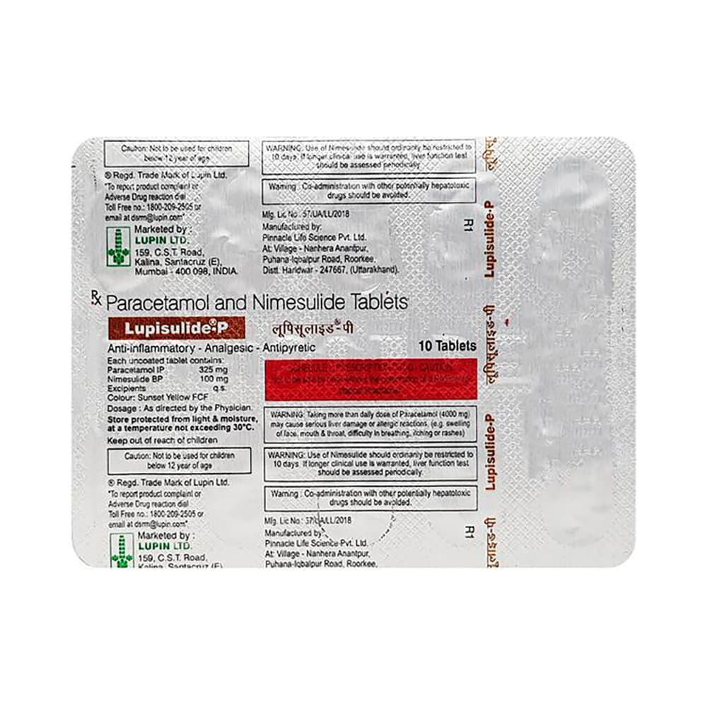 Lupisulide P Tablet is a combination of two medicines: Nimesulide and Paracetamol. It works by blocking the release of certain chemical messengers that cause fever, pain and inflammation (redness and swelling).