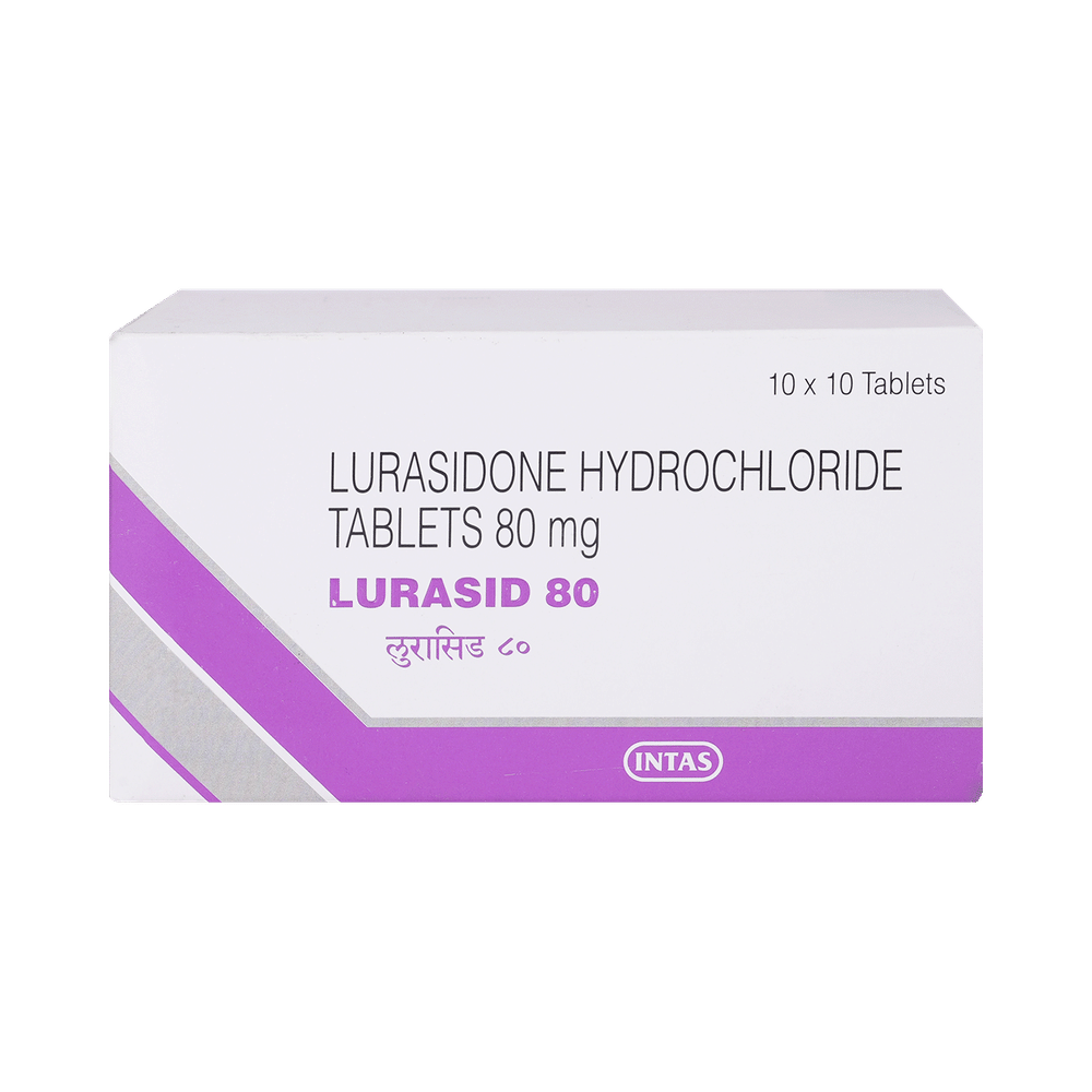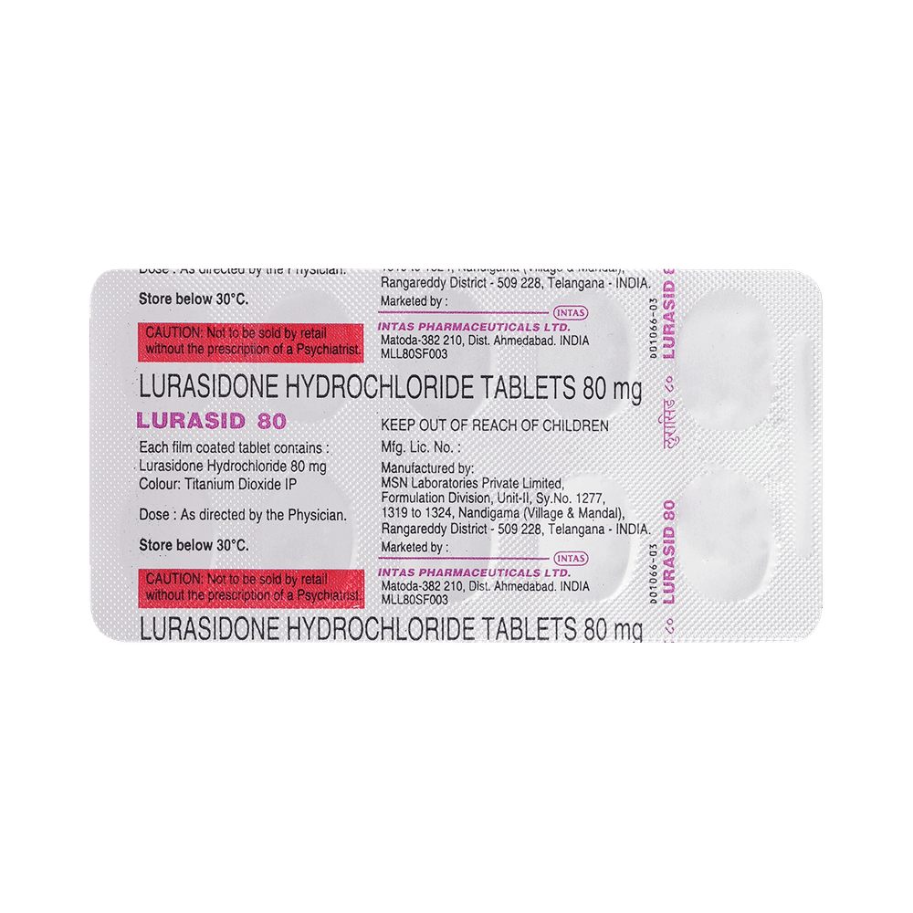 Lurasid 80mg Tablet is used in the treatment of schizophrenia, a mental disorder that can result in hallucinations or delusions and also adversely affects a person’s ability to think and behave. It can also be used to treat depression, mania, and bipolar disorders. Lurasid 80mg Tablet should be taken with food. However, it is advised to take it at the same time each day as this helps to maintain a consistent level of medicine in the body. Take this medicine in the dose and duration as advised by your doctor and if you have missed a dose, take it as soon as you remember. Do not stop taking this medicine suddenly without talking to your doctor as it may worsen your symptoms.Some common side effects of this medicine include nausea, vomiting, dryness in the mouth, and insomnia (difficulty sleeping). It also causes dizziness and sleepiness, so do not drive or do anything that requires mental focus until you know how this medicine affects you. Inform your doctor if you develop any unusual changes in mood or behavior, new or worsening depression, or suicidal thoughts while taking this medicine.This medicine may increase your weight but, modifying your lifestyle by having a healthy diet and exercising regularly can reduce this side effect. You should be cautious as in rare cases it may cause serious side effects like high blood sugar levels or seizures.