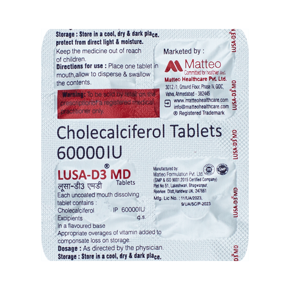 Lusa-D3 MD Tablet Orange is a form of vitamin D. It raises vitamin D levels in your blood. This, in turn, increases calcium levels in your blood by helping you absorb more calcium from food.