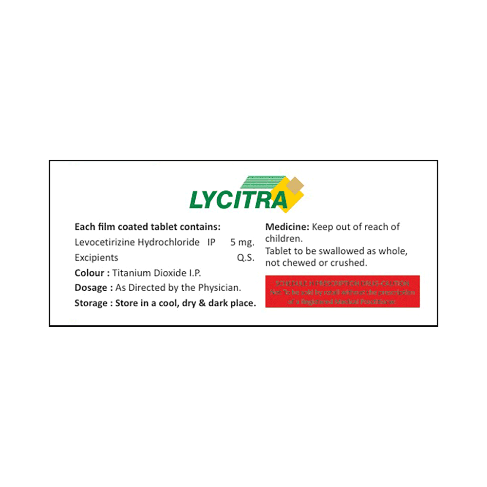 Lycitra Tablet belongs to a group of medicines called antihistamines. It is used to treat various allergic conditions such as hay fever, conjunctivitis, some skin reactions such as eczema, hives, and reactions to bites and stings. It also relieves watery eyes, runny nose, sneezing, and itching. Lycitra Tablet can be taken with or without food. The dose required by you may vary depending on what you are taking it for. This medicine is usually taken in the evening, but follow the advice of your doctor on how to take it. You may need this medicine only on days you have symptoms, but if you are taking it to prevent the symptoms then you should take it regularly. If you miss doses or stop taking it earlier than advised, your symptoms may come back.Common side effects include somnolence (sleepiness), dry mouth, fatigue, fever, cough, nasopharyngitis, and nosebleed. These are usually mild and go away after a couple of days as your body adjusts to it. Consult your doctor if any of the side effects persist or worry you.Before taking it, tell your doctor if you have any kidney problems or epilepsy (seizures). Your dose may need to be modified or this medicine may not suit you. Some other medicines can interact with this medicine so let your healthcare team know what else you are taking. You should also talk to your doctor before using this medicine if you are pregnant or breastfeeding, although it is not thought to be harmful.