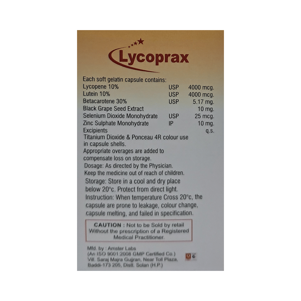 Lycoprax Soft Gelatin Capsule is a combination of vitamins, antioxidants, and minerals. Beta-carotene and lycopene are powerful antioxidants that protect the body from damaging molecules called free radicals and help boost the immune system. The antioxidants in black grape seed extract may help alleviate the oxidative stress, inflammation, and tissue damage that can occur alongside chronic diseases. Lutein functions as a light filter and protects the eye tissues from sunlight damage. Selenium dioxide acts as a resource of selenium that prevents cell damage and protects the body from the poisonous effects of heavy metals and other harmful substances. Zinc is needed for the body's immune system to work properly. It plays a role in growth, wound healing, and maintaining gut health. Zinc is also needed for the senses of taste and smell.
