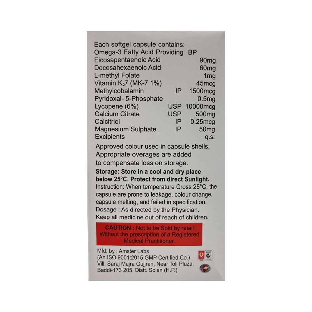 Salt Composition: L-Methyl Folate (1mg) + Methylcobalamin (1500mcg) + Pyridoxal-5-phosphate (0.5mg) + Lycopene (10000mcg) + Calcium Citrate Malate (500mg) + Calcitriol (0.25mcg) + Omega-3 fatty acid (150mg) + Magnesium Sulphate (50mg)