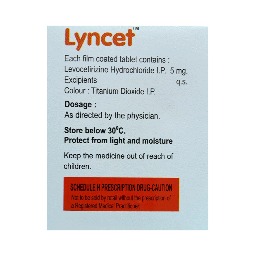 Lyncet Tablet belongs to a group of medicines called antihistamines. It is used to treat various allergic conditions such as hay fever, conjunctivitis, some skin reactions such as eczema, hives, and reactions to bites and stings. It also relieves watery eyes, runny nose, sneezing, and itching. Lyncet Tablet can be taken with or without food. The dose required by you may vary depending on what you are taking it for. This medicine is usually taken in the evening, but follow the advice of your doctor on how to take it. You may need this medicine only on days you have symptoms, but if you are taking it to prevent the symptoms then you should take it regularly. If you miss doses or stop taking it earlier than advised, your symptoms may come back.Common side effects include somnolence (sleepiness), dry mouth, fatigue, fever, cough, nasopharyngitis, and nosebleed. These are usually mild and go away after a couple of days as your body adjusts to it. Consult your doctor if any of the side effects persist or worry you.Before taking it, tell your doctor if you have any kidney problems or epilepsy (seizures). Your dose may need to be modified or this medicine may not suit you. Some other medicines can interact with this medicine so let your healthcare team know what else you are taking. You should also talk to your doctor before using this medicine if you are pregnant or breastfeeding, although it is not thought to be harmful.
