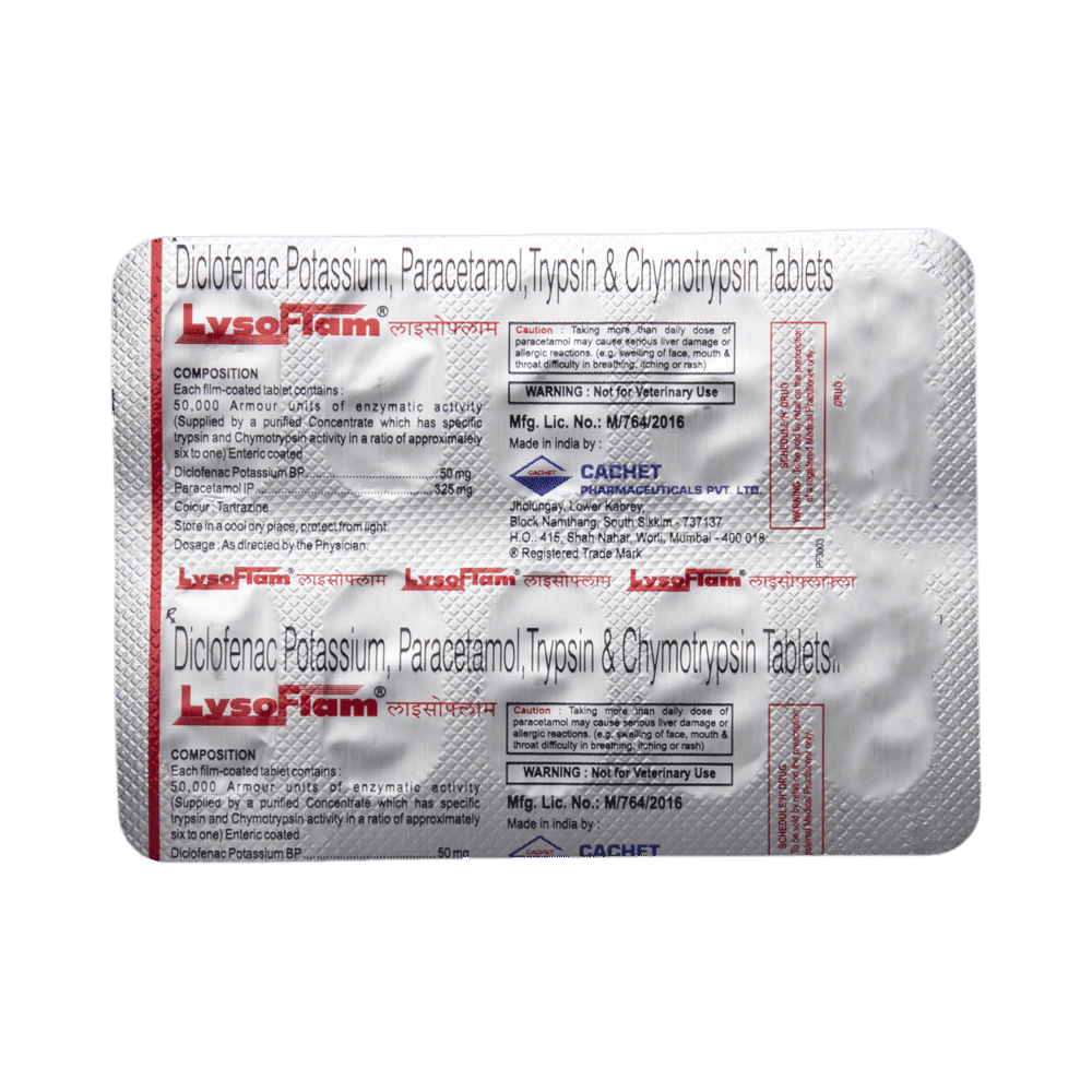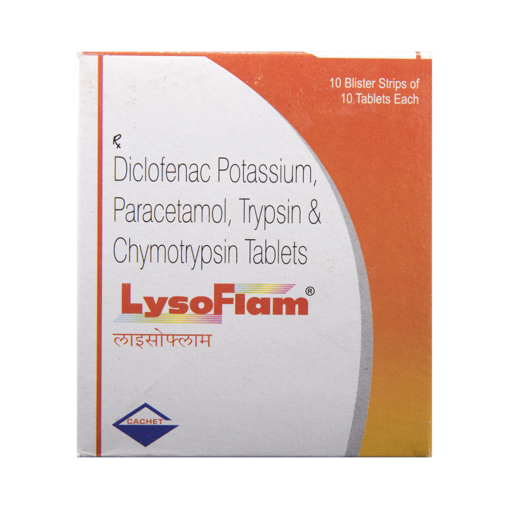 LYSoflam Tablet is a combination of three medicines: Diclofenac, Paracetamol and Trypsin Chymotrypsin which relieve pain. Diclofenac is a non-steroidal anti-inflammatory drug (NSAID) and Paracetamol is an antipyretic (fever reducer). They work by blocking the release of certain chemical messengers (prostaglandins) in the brain that cause pain and fever. Trypsin Chymotrypsin is a combination of enzymes that break down proteins into smaller fragments, thereby making them available for absorption into the blood. They increase blood supply in the affected area and reduce swelling.