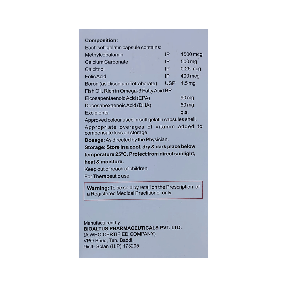 Salt Composition: Calcitriol (0.25mcg) + Calcium Carbonate (500mg) + Omega-3 fatty acid (150mg) + Methylcobalamin (1500mcg) + Folic Acid (400mcg) + Boron (1.5mg)