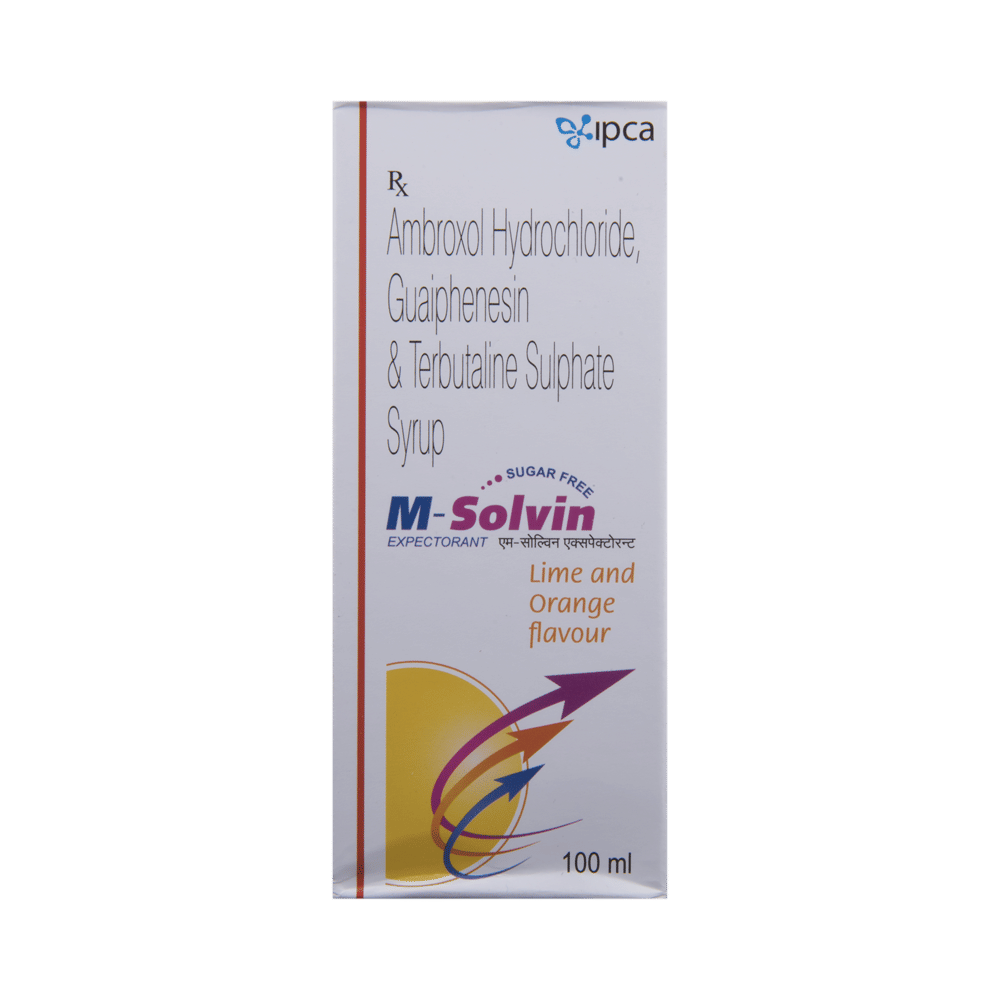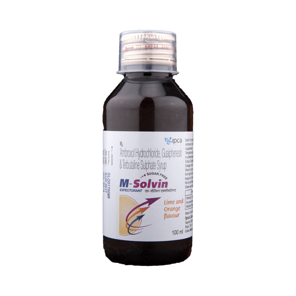 M-Solvin Syrup Lime is used in the treatment of cough with mucus. It loosens and thins mucus in the nose, windpipe, and lungs. This makes it easier for you to cough it out. It also relaxes and widens the muscles in the airways making it easier for you to breathe. M-Solvin Syrup Lime is taken with or without food in a dose and duration as advised by the doctor. The dose you are given will depend on your condition and how you respond to the medicine. You should keep taking this medicine for as long as your doctor recommends. If you stop treatment too early your symptoms may come back and your condition may worsen. Let your doctor know about all other medications you are taking as some may affect, or be affected by this medicine.The most common side effects are nausea, vomiting, diarrhea, stomach pain, upset stomach, headache, rash, palpitations, tremor, and increased heart rate. Most of these are temporary and usually resolve with time. Contact your doctor straight away if you are at all concerned about any of these side effects. This medicine can also cause sleepiness, so do not drive or do anything that requires mental focus until you know how this medicine affects you. Avoid drinking alcohol while taking this medicine as it can make sleepiness worse.Never support self-medication or recommend your medicine to another person. It is beneficial to have plenty of fluids while taking this medication. Before taking this medicine, you should tell your doctor if you are pregnant, planning pregnancy or breastfeeding. You should also tell your doctor if you have any kidney or liver diseases so that your doctor can prescribe a suitable dose for you.