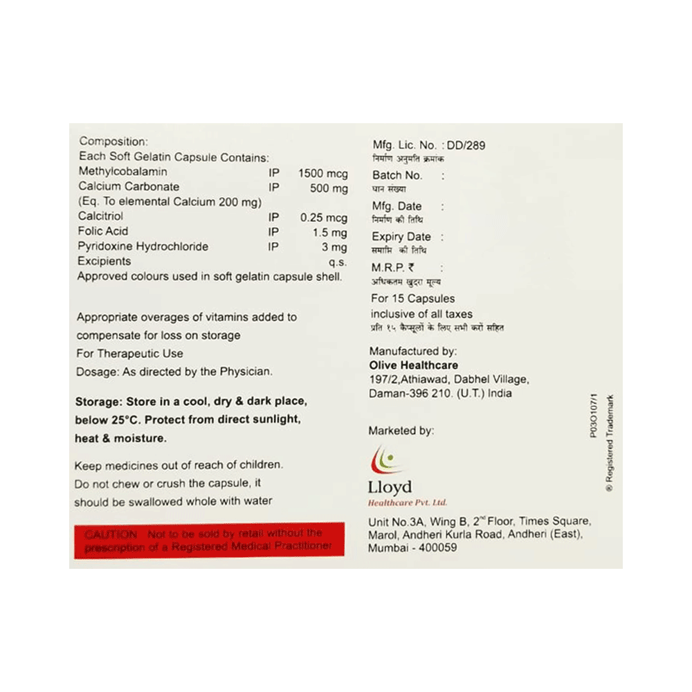 Salt Composition: Calcium (500mg) + Calcitriol (0.25mcg) + Methylcobalamin (1500mcg) + Folic Acid (1.5mg) + Vitamin B6 (Pyridoxine) (3mg)