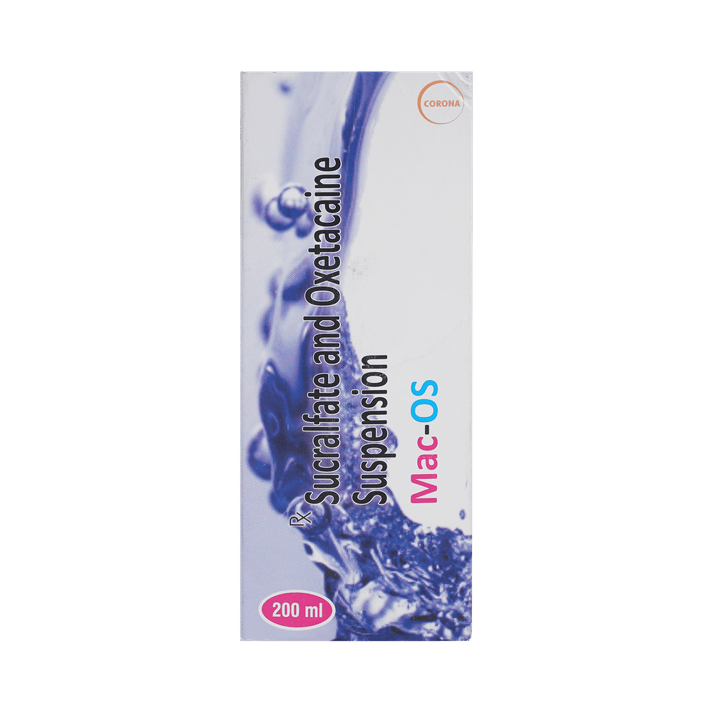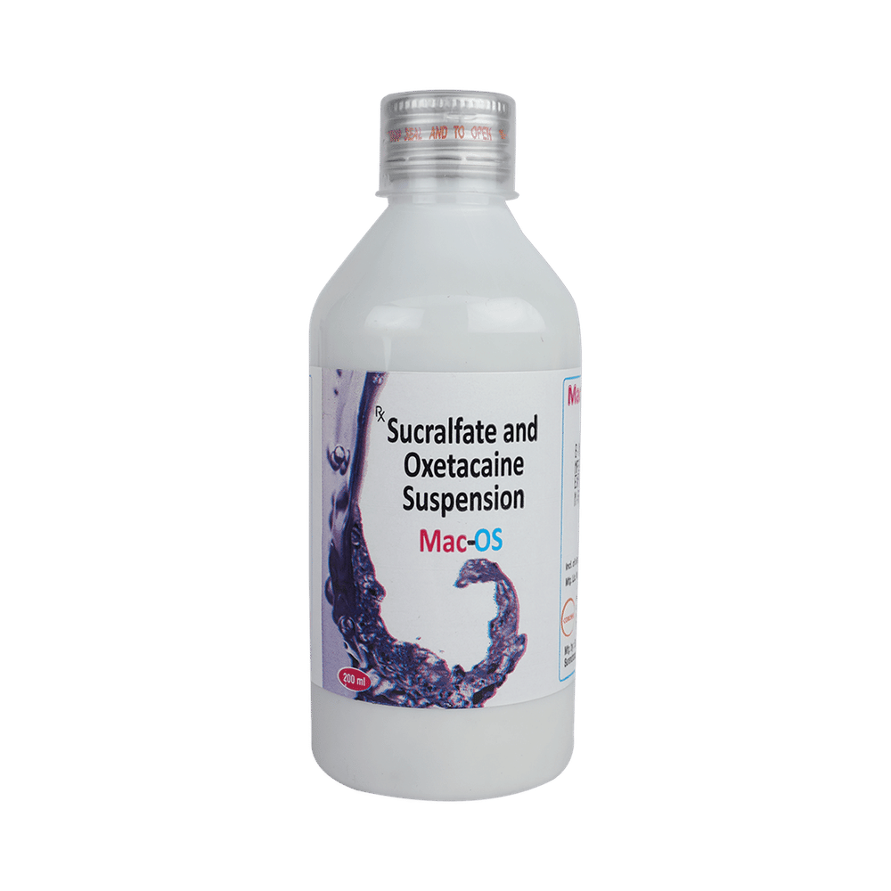 Mac OS Suspension is a combination of two medicines: Sucralfate and Oxetacaine / Oxethazaine. Sucralfate is a medication to treat ulcers. It covers the damaged ulcer tissue in the stomach and protects it from acid or injury to facilitate healing. Oxetacaine / Oxethazaine is a local anesthetic whose numbing effect provides fast relief from pain caused due to ulcers or acidic injury in the stomach.