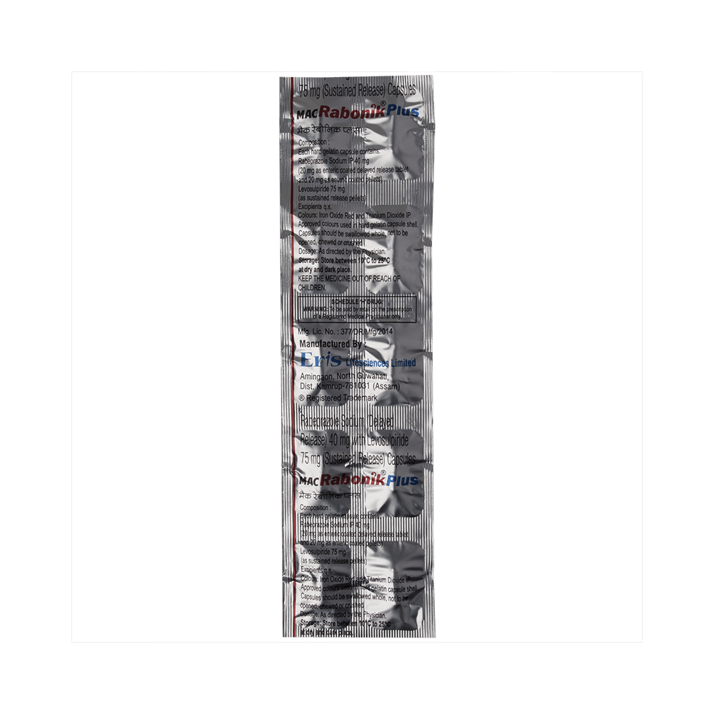 Mac Rabonik Plus Capsule SR is a prescription medicine which is used in the treatment of gastroesophageal reflux disease (acid reflux), intestinal ulcers, and irritable bowel syndrome. It reduces excess acid production in the stomach and prevents the reflux of stomach acid into the food pipe. Mac Rabonik Plus Capsule SR is taken with or without food in a dose and duration as advised by the doctor. The dose you are given will depend on your condition and how you respond to the medicine. You should keep taking this medicine for as long as your doctor recommends. If you stop treatment too early your symptoms may come back and your condition may worsen. Let your healthcare team know about all other medications you are taking as some may affect, or be affected by this medicine.The most common side effects are nausea, stomach pain, diarrhea, flatulence, constipation, headache, weakness, and flu-like symptoms. Most of these are temporary and usually resolve with time. Contact your doctor straight away if you are at all concerned about any of these side effects. It may also cause dizziness and sleepiness, so do not drive or do anything that requires mental focus until you know how this medicine affects you. Avoid drinking alcohol while taking this medicine as it can worsen your sleepiness.Lifestyle modifications like having fiber-rich diet, avoiding foods that trigger your symptoms, increasing fluid intake and regular exercise can help you to get better results. Before taking it, you should tell your doctor if you have any kidney or liver diseases. You should also tell your doctor if you are pregnant, planning pregnancy or breastfeeding.