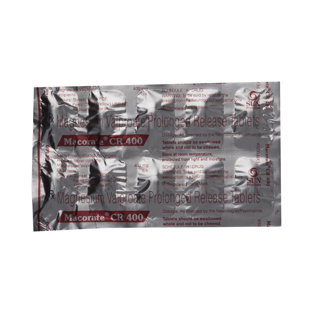 In Epilepsy/SeizuresMacorate CR 400 Tablet helps prevent and control seizures (fits) by decreasing the nerve impulses which cause the seizures. By controlling the frequency of seizures, it will help you go about your daily activities with more confidence. It helps reduce symptoms such as confusion, uncontrollable jerking movements, loss of awareness, and fear or anxiety.This medicine is not associated with any physical or psychological dependence (addiction) but it should not be stopped suddenly. It must be taken regularly as prescribed to be effective. Missing doses may trigger a seizure.In Bipolar disorderMacorate CR 400 Tablet works to restore the normal balance of nerve activity in your brain. It can help prevent extreme changes in mood and help you feel less agitated. You may experience fewer episodes of low mood. It can take several weeks for this medicine to work and you may still feel low during this time. It is likely that you will take this medicine for at least six months but possibly much longer. It needs to be taken regularly to work effectively. Do not stop taking it unless your doctor advises you to. You should continue to eat well and keep fit to reduce symptoms of bipolar disorder.show moreshow less