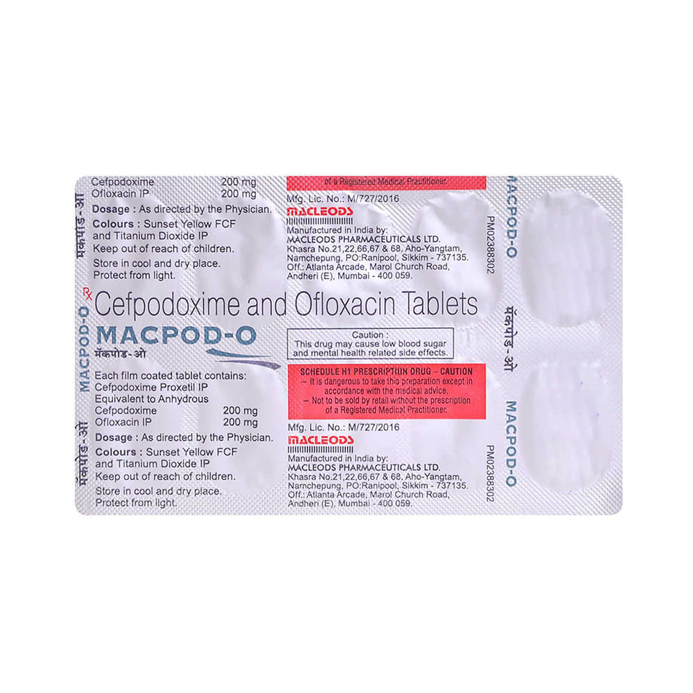 Macpod O 200 mg/200 mg Tablet is a combination medicine that is used to treat various types of bacterial infections. It fights against the microorganisms to prevent their growth and further spread of the infection. Macpod O 200 mg/200 mg Tablet is a prescription medicine. It is advised to take it as per the prescription. It can be taken with or without food, but it must be taken at a fixed time to ensure better efficacy. Do not consume more than the recommended dose, as this may have harmful effects on your body. If you miss a dose, take it as soon as you remember. The course of the treatment must be completed even if you feel better. Sudden discontinuation of the treatment may affect the potency of the medicine.Some common side effects of this medicine are nausea, vomiting, diarrhea, indigestion, etc. If any of the side effects get aggravated, you must consult your doctor immediately. If you experience any allergic reaction (rashes, itching, swelling, shortness of breath, etc.), you must seek immediate medical help.Before taking this medicine, you should tell your doctor if you are taking any medicines for any health condition. Pregnant or breastfeeding women should also consult with their doctor before taking it. Avoid drinking alcohol as it can cause excessive drowsiness with this medicine. It usually does not impair your ability to drive, but you should not drive if it makes you feel sleepy or dizzy. You must take adequate rest for a faster recovery, also take a healthy diet and drink plenty of water. Your doctor may ask for a few laboratory and diagnostic tests to know the effects of the medicine on your body.