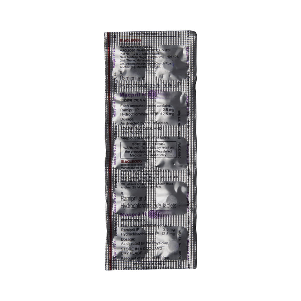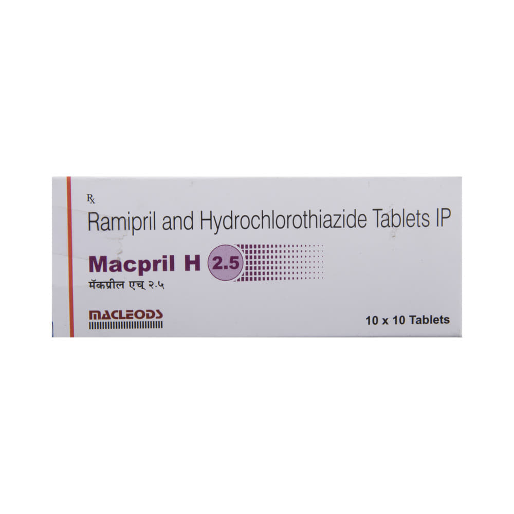 Macpril H 2.5 Tablet is a medicine used to treat hypertension (high blood pressure). It is a combination of two medicines that helps to control blood pressure when a single medication is not effective. It helps to reduce the chances of any future heart attack and stroke. Macpril H 2.5 Tablet is taken with or without food, preferably in the morning to avoid frequent urination at night. Keep taking it for as long as advised by your doctor. Even if you feel well, do not stop this medicine on your own because high blood pressure often has no symptoms. If you stop taking it, your condition may get worse. Keeping active with regular exercise, reducing your weight and eating a healthy diet will also help control your blood pressure. Follow your doctor’s advice while taking this medicine.Nausea, indigestion, taste change, and diarrhea are some common side effects of this medicine. Consult your doctor If any of these bother you, or get worse, or do not go away. Let your doctor know about cough or throat irritation that does not go away. Drink plenty of fluids while taking medicine to overcome muscle weakness, dry mouth, and extreme thirst. Dizziness may occur due to low blood pressure but this gets better with time.Before taking it, let your doctor know if you have any liver or kidney problems. Pregnant or breastfeeding women should also consult their doctor for advice before taking this medicine. You also need to tell your doctor what other medicines you are taking especially those used to treat high blood pressure or heart conditions. You should have your blood pressure, kidney function and the levels of salts such as potassium checked regularly to make sure that this medicine is working properly.