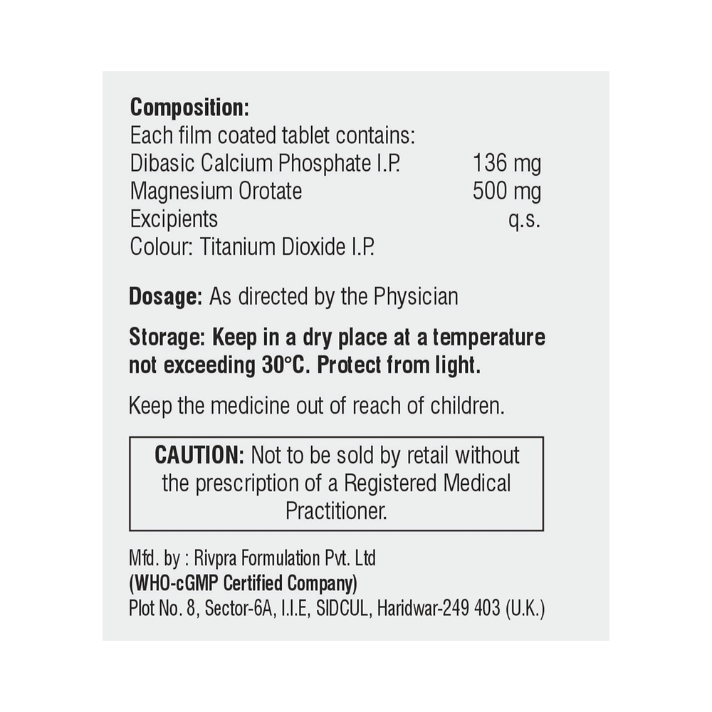 Salt Composition: Dibasic Calcium Phosphate (136mg) + Magnesium Orotate (500mg)