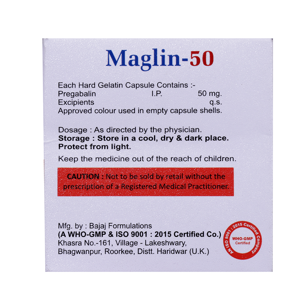 Maglin 50 Capsule is a medicine used to relieve pain caused by nerve damage (neuropathic pain) due to diabetes, shingles (herpes zoster infection), spinal cord injury, or other conditions. It is also used to treat widespread muscle pain and stiffness in people with fibromyalgia. Maglin 50 Capsule belongs to the anti-epileptic group of medicines and can also be used to treat certain types of seizures (fits) in combination with other medicines. Additionally, it may also be prescribed to treat the symptoms of anxiety disorder if other medicines are not suitable.You can take Maglin 50 Capsule with or without food, but it is important to take this medicine at the same time each day to get the most benefit. The exact dose and duration of treatment will depend on your condition and how you respond to it. Your doctor will probably start this medicine at a low dose and increase it gradually. It may take a few weeks for the medicine to work properly. Follow your doctor’s instructions and continue taking it regularly until your doctor advises you to stop. Do not miss any dose, otherwise, your condition may worsen.The side effects of this medicine are usually mild and go away by themselves. The most common ones are feeling sleepy or dizzy, dryness in the mouth, blurred vision, weight gain, edema (swelling over the whole body), and difficulty in concentrating. Most side effects are not serious and do not need medical attention. Talk to your doctor about potential side effects and ways in which you might prevent or cope with them.Before taking the medicine you should tell your doctor if you are pregnant, breastfeeding, or planning to become pregnant. Be careful while driving as sleepiness, dizziness, and blurring of vision may be seen as side effects. You should avoid drinking alcohol along with this medicine as it may lead to excessive sleepiness and dizziness.