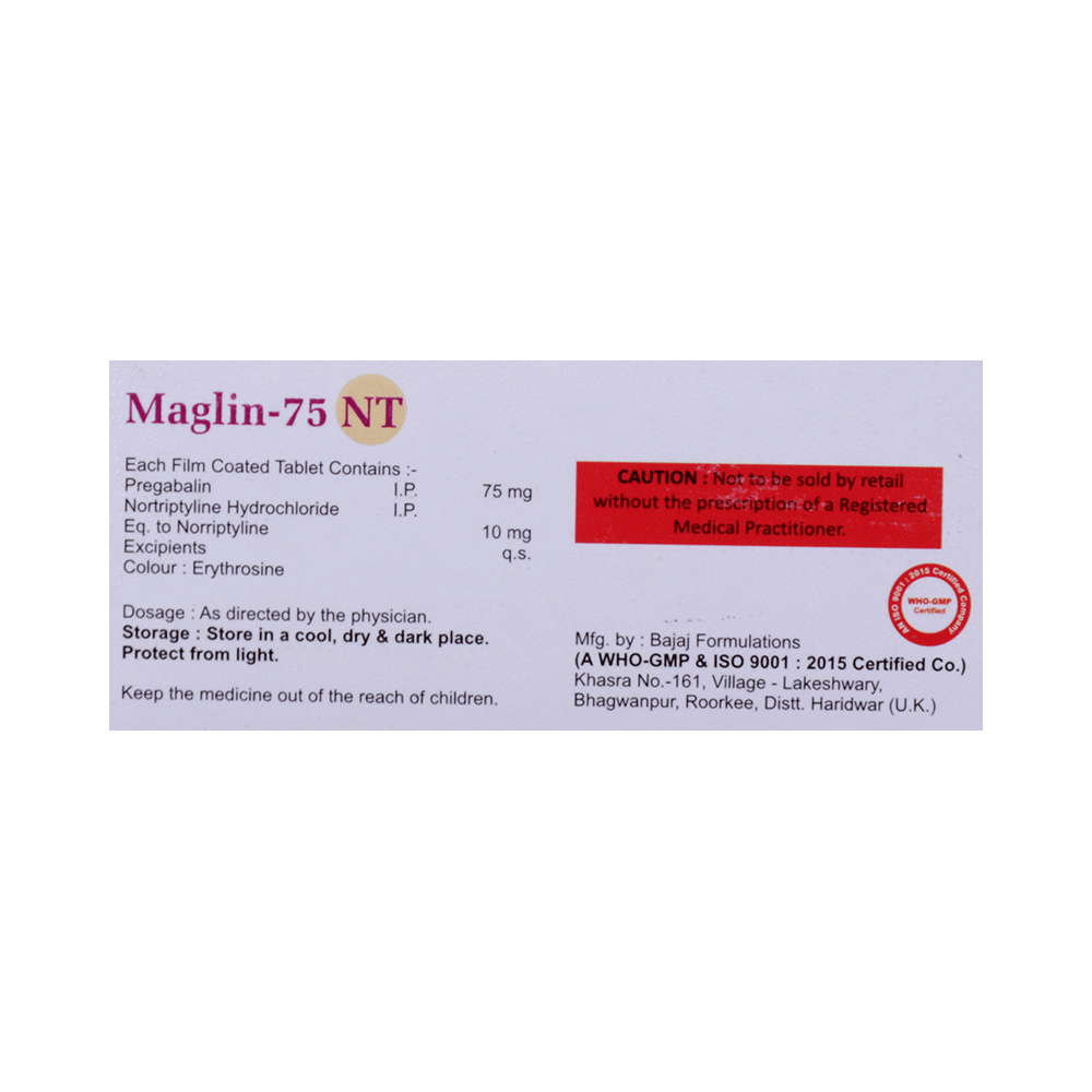 Maglin 75 NT Tablet is a combination medicine used for the treatment of neuropathic pain. This medicine decreases the pain by stopping the movement of pain signals to the brain. Maglin 75 NT Tablet may be taken with or without food, preferably at bedtime. Take it at the same time each day as this helps to maintain a consistent level of medicine in the blood. Take this medicine in the dose and duration advised by your doctor. If you miss a dose of this medicine, take it as soon as you remember. Finish the complete course of treatment even if you feel better. Do not stop this medication suddenly without talking to the doctor.Some common side effects of this medicine include constipation, nausea, vision disturbance, and excessive sweating. It may also cause dizziness and sleepiness. So, do not drive or do anything that requires mental focus until you know how this medicine affects you. This medicine may cause weight gain, and to control it, you should exercise regularly and have a balanced diet. It is important to inform your doctor if you develop any unusual changes in mood or behavior, new or worsening depression, or suicidal thoughts.Before taking Maglin 75 NT Tablet, let your doctor know if you suffer from kidney or liver disease. Your doctor should also know about all other medicines you are taking, as many of these may make this medicine less effective or change the way it works. Inform your doctor if you are pregnant, planning pregnancy, or breastfeeding.