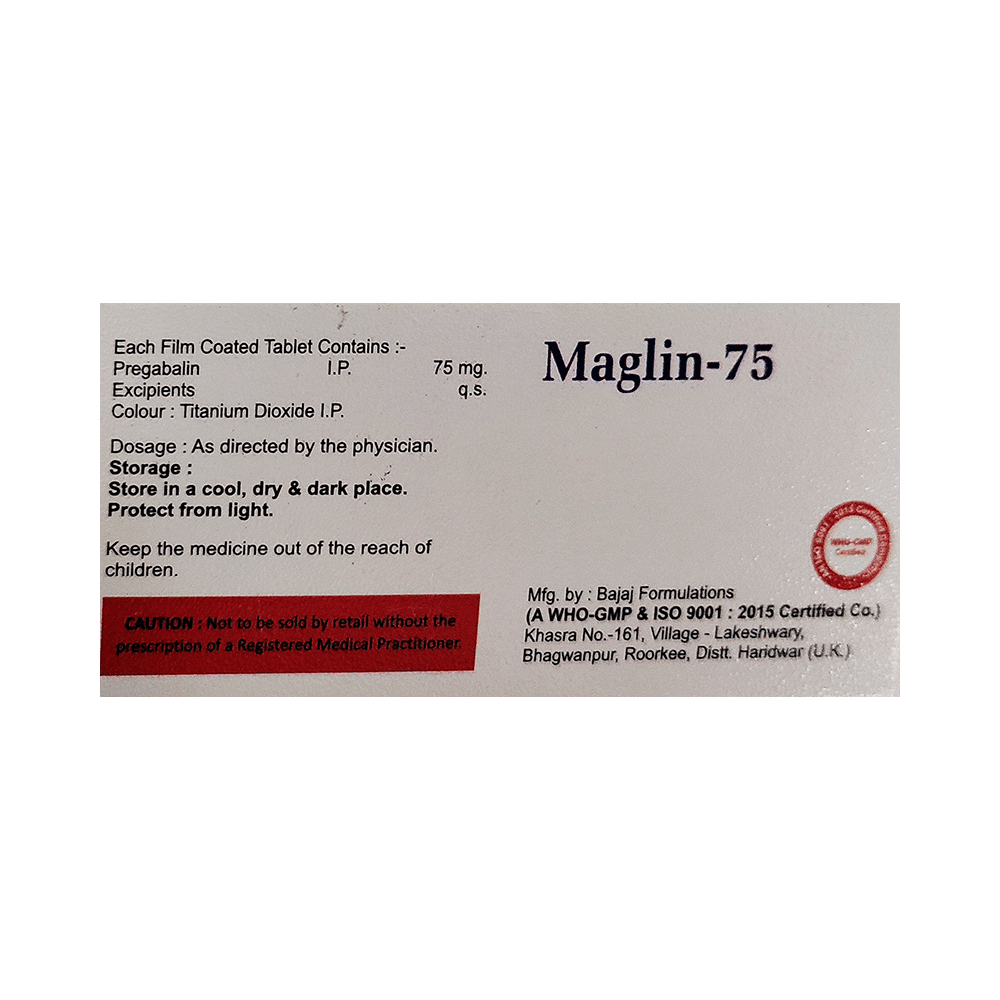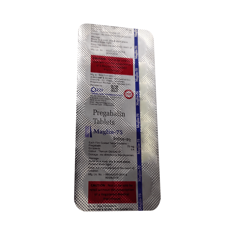 Maglin 75 Tablet is a medicine used to relieve pain caused by nerve damage (neuropathic pain) due to diabetes, shingles (herpes zoster infection), spinal cord injury, or other conditions. It is also used to treat widespread muscle pain and stiffness in people with fibromyalgia. Maglin 75 Tablet belongs to the anti-epileptic group of medicines and can also be used to treat certain types of seizures (fits) in combination with other medicines. Additionally, it may also be prescribed to treat the symptoms of anxiety disorder if other medicines are not suitable.You can take Maglin 75 Tablet with or without food, but it is important to take this medicine at the same time each day to get the most benefit. The exact dose and duration of treatment will depend on your condition and how you respond to it. Your doctor will probably start this medicine at a low dose and increase it gradually. It may take a few weeks for the medicine to work properly. Follow your doctor’s instructions and continue taking it regularly until your doctor advises you to stop. Do not miss any dose, otherwise, your condition may worsen.The side effects of this medicine are usually mild and go away by themselves. The most common ones are feeling sleepy or dizzy, dryness in the mouth, blurred vision, weight gain, edema (swelling over the whole body), and difficulty in concentrating. Most side effects are not serious and do not need medical attention. Talk to your doctor about potential side effects and ways in which you might prevent or cope with them.Before taking the medicine you should tell your doctor if you are pregnant, breastfeeding, or planning to become pregnant. Be careful while driving as sleepiness, dizziness, and blurring of vision may be seen as side effects. You should avoid drinking alcohol along with this medicine as it may lead to excessive sleepiness and dizziness.