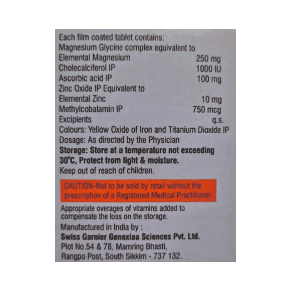 Salt Composition: Magnesium (250mg) + Vitamin D3 (1000IU) + Vitamin C (100mg) + Zinc Oxide (10mg) + Methylcobalamin (750mcg)