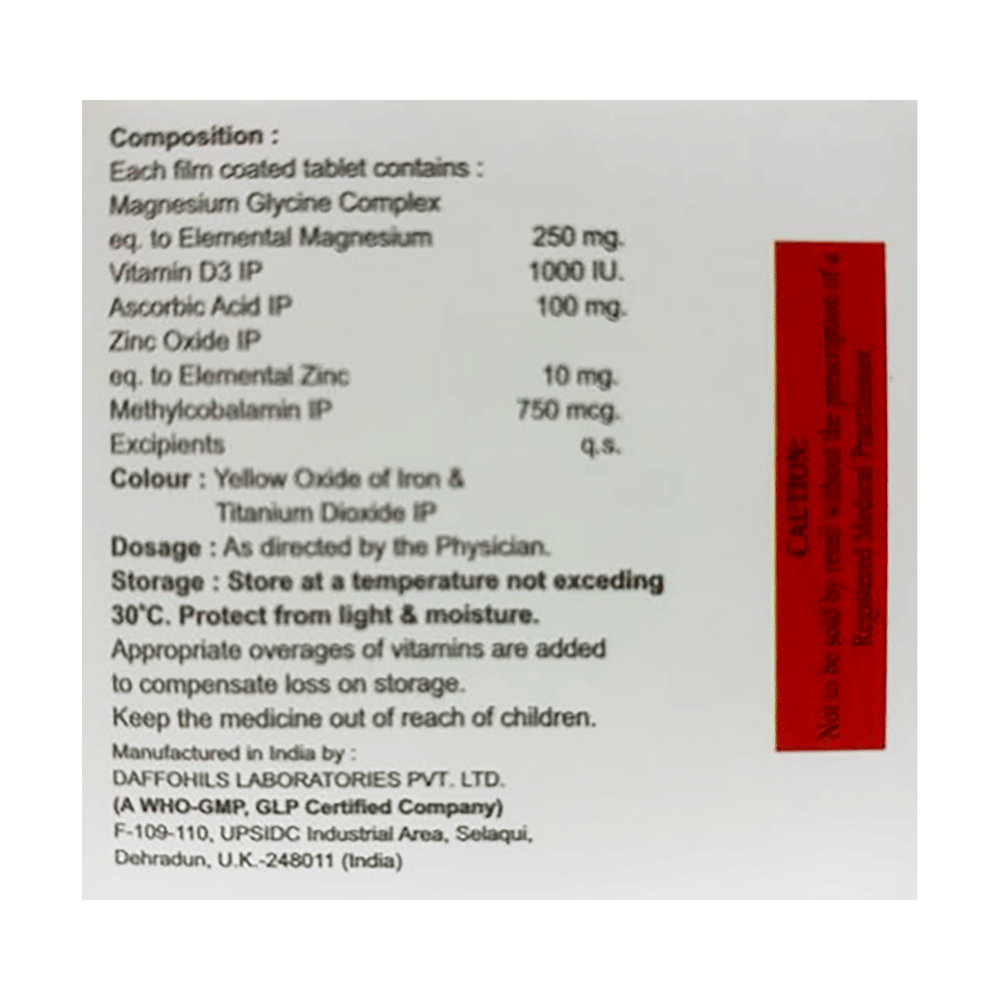 Salt Composition: Magnesium (250mg) + Vitamin D3 (1000IU) + Vitamin C (100mg) + Zinc Oxide (10mg) + Methylcobalamin (750mcg)