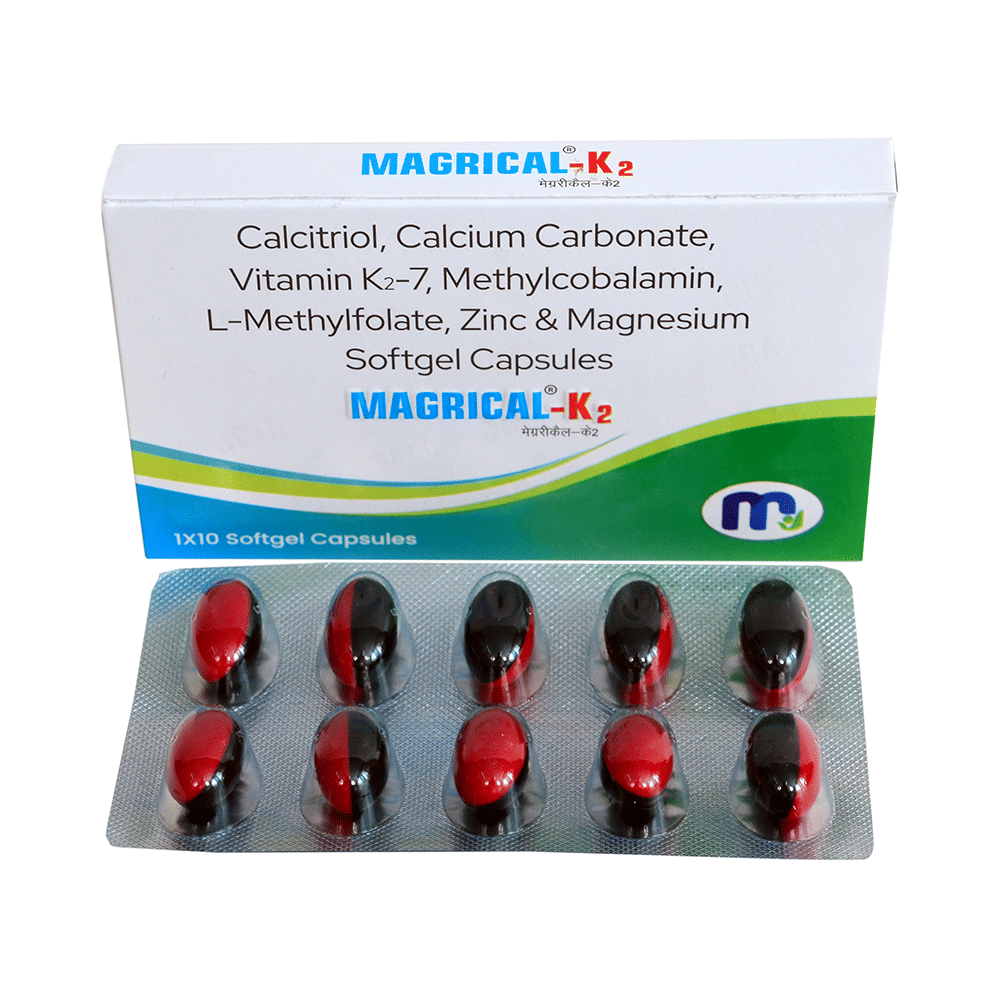 Magrical-K2 Softgel Capsule is a combination of medicines that is used to treat nutritional deficiencies. It helps in proper growth and development of cells, bone and improves heart health. It also helps in protein synthesis and production of blood cells like red blood cells or white blood cells and boosts immunity. Magrical-K2 Softgel Capsule may be taken with or without food. It should be used in the dose and duration as prescribed by your doctor. It is advised to take this medicine at a fixed time.This medicine should not be taken more than the recommended dose. It is usually a safe medicine with very minimal or no side effects. However, if you experience severe diarrhea, vomiting, or constipation, you should consult your doctor without delay.Before taking this medicine, tell your doctor if you have any other health conditions. Inform your doctor if you are taking any other medicines or if you are pregnant or breastfeeding.