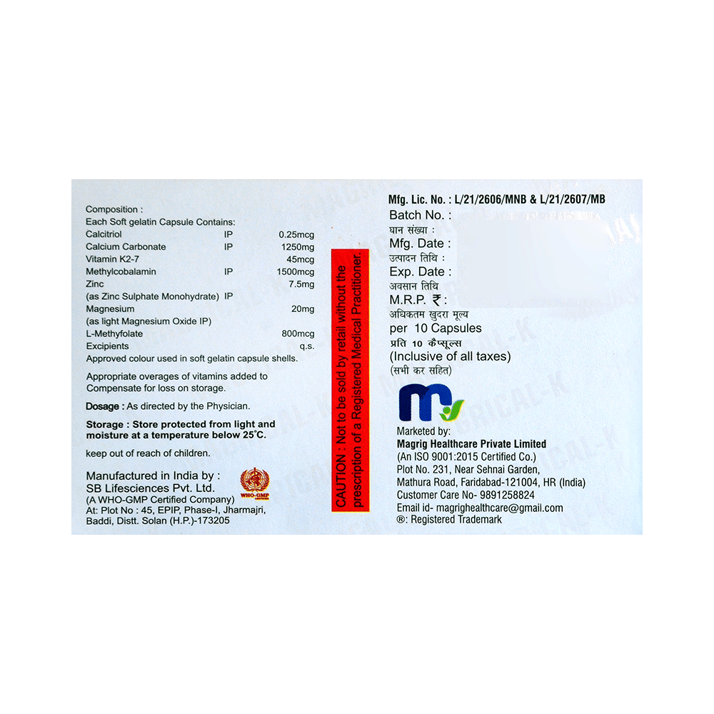 Magrical-K2 Softgel Capsule is a combination of seven nutritional supplements. Calcitriol is a synthetic Vitamin D that regulates the absorption of calcium in the body and strengthens the bones. Calcium citrate increases calcium depositing in the bones that increase the density of the bones to them stronger. Vitamin K2-7 is a vitamin that improves bone and heart health. Methylcobalamin is an active form of Vitamin B 12. This helps in proper cell growth and development, helps in protein synthesis and production of blood cells (red and white blood cells). Zinc Oxide is a mineral supplement that works to boost up the immune system and also promotes growth. Magnesium Oxide is a mineral supplement that promotes heart and bone health. L-Methyl Folate is a nutritional supplement that increases the production of blood (red blood cells) in the body. This is how it works in the treatment of nutritional deficiencies.