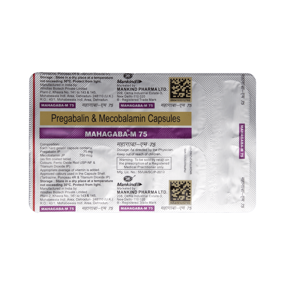 Mahagaba-M 75 Capsule is a prescription medicine used for the treatment of neuropathic pain. It decreases pain by modulating the calcium channel activity of the nerve cells. This medicine also protects nerve fibers and heals damaged nerve cells. Mahagaba-M 75 Capsule may be taken with or without food, preferably at bedtime. It is advised to take it at the same time each day as this helps to maintain a consistent level of medicine in the body. Take this medicine in the dose and duration advised by your doctor. If you miss a dose of this medicine, take it as soon as you remember. Finish the full course of treatment even if you feel better. This medication must not be stopped suddenly without talking to the doctor.Some common side effects of this medicine include nausea, vomiting, diarrhea, constipation, blurred vision, dizziness, and sleepiness. Do not drive or do anything that requires mental focus until you know how this medicine affects you. The side effects are mild and usually improve with time. It may also cause weight gain in some people. Exercise regularly and have a balanced diet to keep your weight in check. Inform your doctor if you develop any unusual changes in mood or behavior, new or worsening depression, or suicidal thoughts.Your doctor should also know about all other medicines you are taking, as many of these may make this medicine less effective or change the way it works. Inform your doctor if you are pregnant, planning pregnancy, or breastfeeding to make sure it is safe for you and the developing baby.