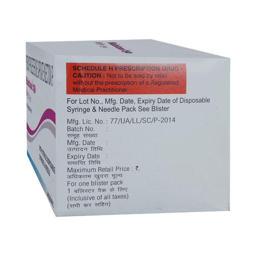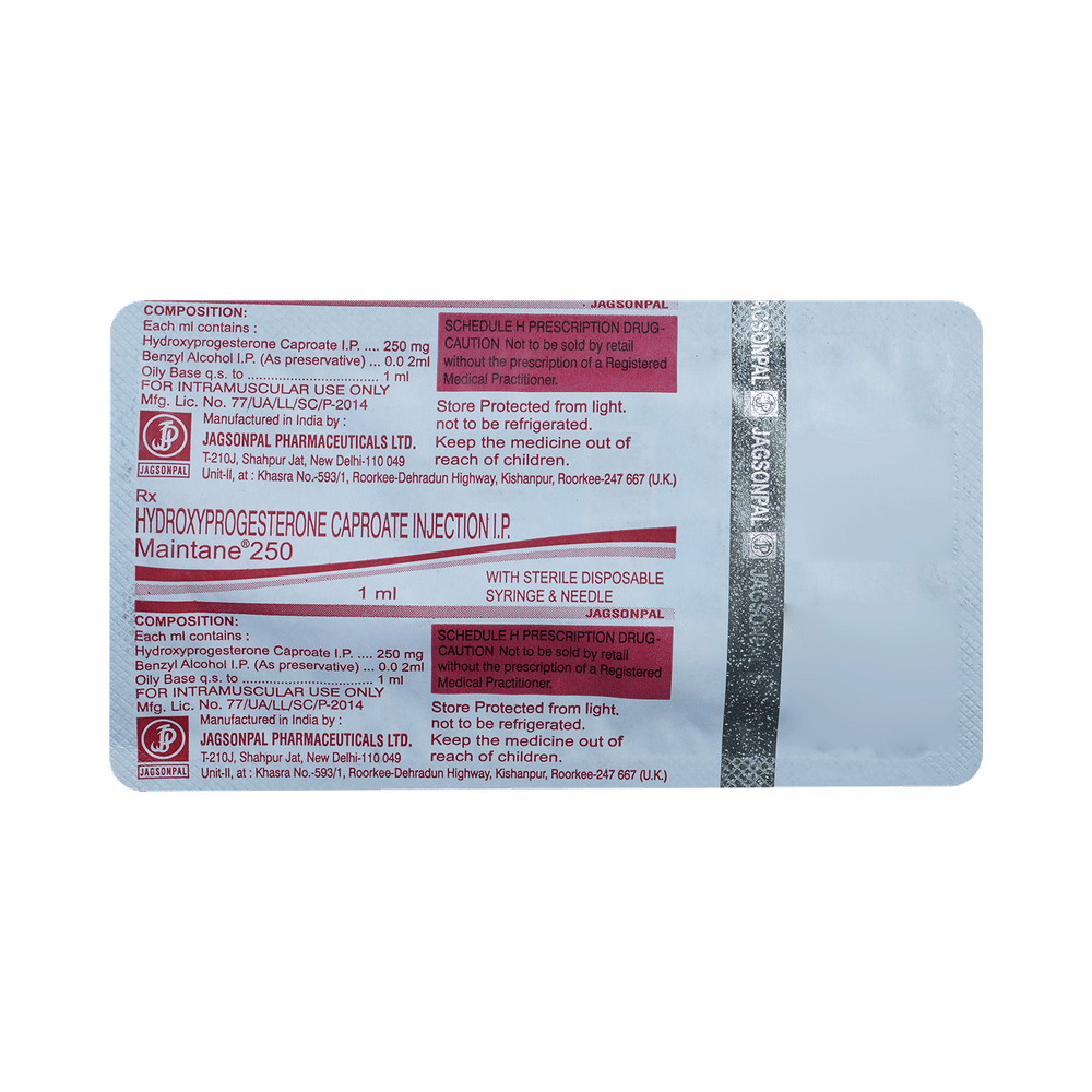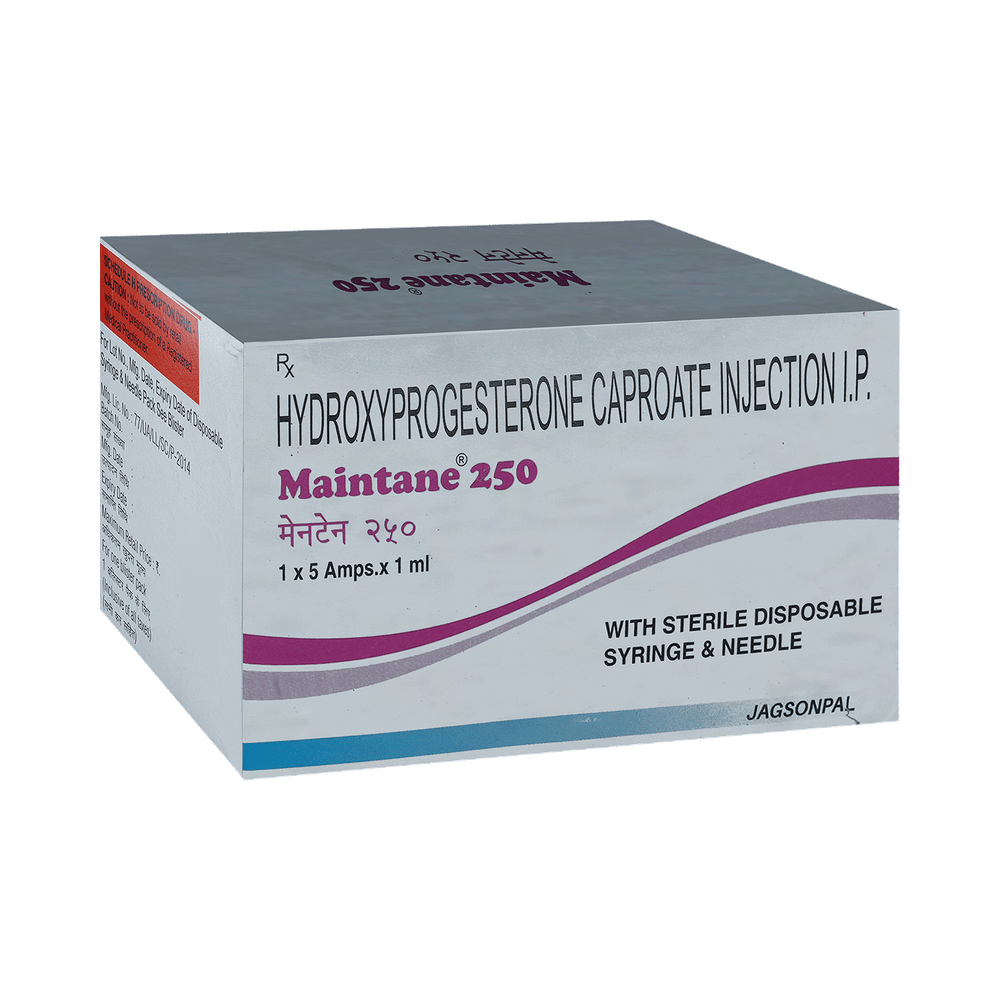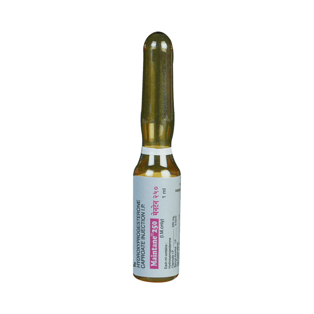 Maintane 250 Injection is used to prevent premature labor in pregnant women in order to reduce the risk of giving birth too early (preterm birth). It prevents miscarriage and lowers the risk of premature birth in women who have had one premature delivery in the past. Maintane 250 Injection is administered only by or under the supervision of a doctor. It should be taken as your doctor advice. Your doctor will decide how much you need to take and for how much time. You should take this injection for as long as it is prescribed for you.The most common side effects of this medicine include local site reactions at the injection site, nausea, itching, diarrhea, and rash. If any of these bothers you, let your doctor know. There may be ways of reducing or preventing them. It may affect blood sugar levels, so monitor your blood sugar regularly. It is better to inform the doctor if you notice yellowing of eyes or skin, dark urine, or stomach pain while using this medicine.Before taking this medicine inform doctor, if you have ever had any problems with your blood circulation or have diabetes, or any liver disease. Your doctor should also know about all other medicines you are taking as many of these may make this medicine less effective or change the way it works.