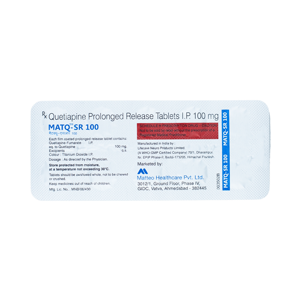 MATQ-SR 100 Tablet is an atypical antipsychotic. It works by modulating the action of certain chemical messengers in the brain that affect thoughts.