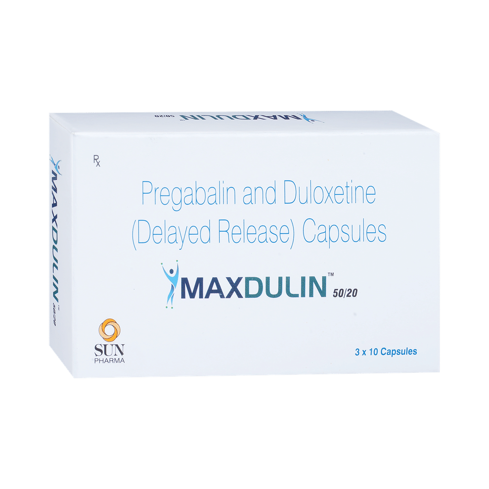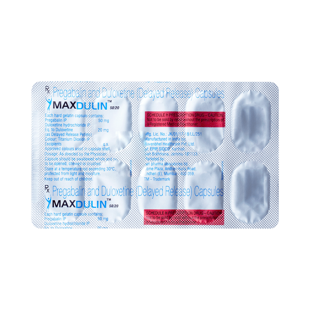 Maxdulin 50/20 Capsule DR is used for the treatment of neuropathic pain. It decreases pain by controlling calcium channel activity of the nerve cells. It also increases the level of chemical messengers in the brain that helps maintain mental balance and stop the movement of pain signals in the brain. Maxdulin 50/20 Capsule DR can be taken with or without food. However, it is advised to take it at the same time each day as this helps to maintain a consistent level of medicine in the body. Take this medicine in the dose and duration advised by your doctor as this is habit forming medicine. If you miss a dose of this medicine, take it as soon as you remember. Finish the full course of the treatment even if you feel better. It is important not to stop taking this medicine suddenly as it may worsen your symptoms.Some common side effects of this medicine include peripheral edema, nausea, headache, dryness of mouth, difficulty in concentration and blurred vision. It may cause dizziness and sleepiness, so do not drive or do anything that requires mental focus until you know how this medicine affects you. This medicine may cause weight gain and to control it, you should have a balanced diet and exercise regularly. It is important to inform your doctor if you develop any unusual changes in mood or behavior, new or worsening depression, or suicidal thoughts.Before taking this medicine let your doctor know if you suffer from kidney or liver disease. Your doctor should also know about all other medicines you are taking as many of these may make this medicine less effective or change the way it works. Inform your doctor if you are pregnant, planning pregnancy or breastfeeding.