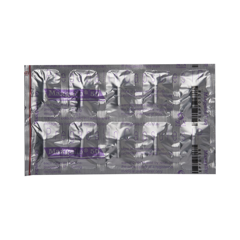 Maxgalin 50 Capsule is a medicine used to relieve pain caused by nerve damage (neuropathic pain) due to diabetes, shingles (herpes zoster infection), spinal cord injury, or other conditions. It is also used to treat widespread muscle pain and stiffness in people with fibromyalgia. Maxgalin 50 Capsule belongs to the anti-epileptic group of medicines and can also be used to treat certain types of seizures (fits) in combination with other medicines. Additionally, it may also be prescribed to treat the symptoms of anxiety disorder if other medicines are not suitable.You can take Maxgalin 50 Capsule with or without food, but it is important to take this medicine at the same time each day to get the most benefit. The exact dose and duration of treatment will depend on your condition and how you respond to it. Your doctor will probably start this medicine at a low dose and increase it gradually. It may take a few weeks for the medicine to work properly. Follow your doctor’s instructions and continue taking it regularly until your doctor advises you to stop. Do not miss any dose, otherwise, your condition may worsen.The side effects of this medicine are usually mild and go away by themselves. The most common ones are feeling sleepy or dizzy, dryness in the mouth, blurred vision, weight gain, edema (swelling over the whole body), and difficulty in concentrating. Most side effects are not serious and do not need medical attention. Talk to your doctor about potential side effects and ways in which you might prevent or cope with them.Before taking the medicine you should tell your doctor if you are pregnant, breastfeeding, or planning to become pregnant. Be careful while driving as sleepiness, dizziness, and blurring of vision may be seen as side effects. You should avoid drinking alcohol along with this medicine as it may lead to excessive sleepiness and dizziness.