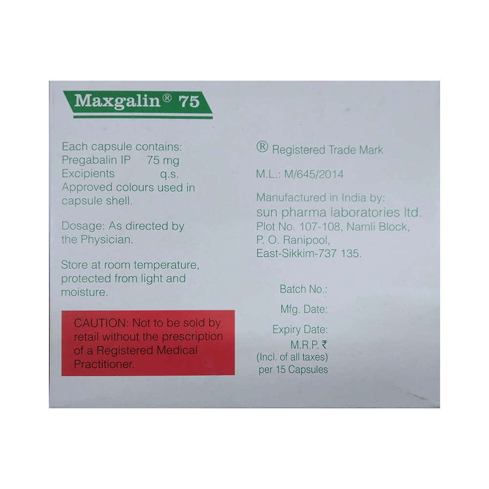 Maxgalin 75 Capsule is a medicine used to relieve pain caused by nerve damage (neuropathic pain) due to diabetes, shingles (herpes zoster infection), spinal cord injury, or other conditions. It is also used to treat widespread muscle pain and stiffness in people with fibromyalgia. Maxgalin 75 Capsule belongs to the anti-epileptic group of medicines and can also be used to treat certain types of seizures (fits) in combination with other medicines. Additionally, it may also be prescribed to treat the symptoms of anxiety disorder if other medicines are not suitable.You can take Maxgalin 75 Capsule with or without food, but it is important to take this medicine at the same time each day to get the most benefit. The exact dose and duration of treatment will depend on your condition and how you respond to it. Your doctor will probably start this medicine at a low dose and increase it gradually. It may take a few weeks for the medicine to work properly. Follow your doctor’s instructions and continue taking it regularly until your doctor advises you to stop. Do not miss any dose, otherwise, your condition may worsen.The side effects of this medicine are usually mild and go away by themselves. The most common ones are feeling sleepy or dizzy, dryness in the mouth, blurred vision, weight gain, edema (swelling over the whole body), and difficulty in concentrating. Most side effects are not serious and do not need medical attention. Talk to your doctor about potential side effects and ways in which you might prevent or cope with them.Before taking the medicine you should tell your doctor if you are pregnant, breastfeeding, or planning to become pregnant. Be careful while driving as sleepiness, dizziness, and blurring of vision may be seen as side effects. You should avoid drinking alcohol along with this medicine as it may lead to excessive sleepiness and dizziness.