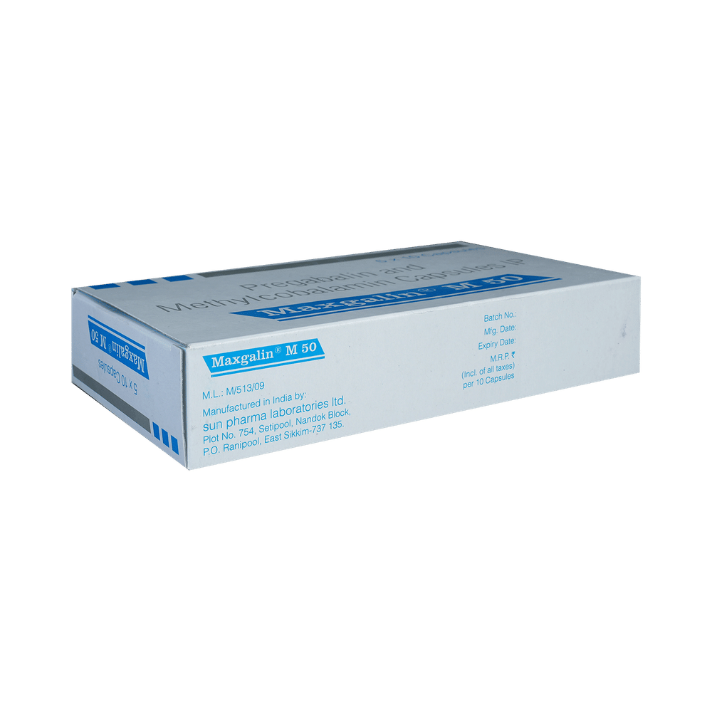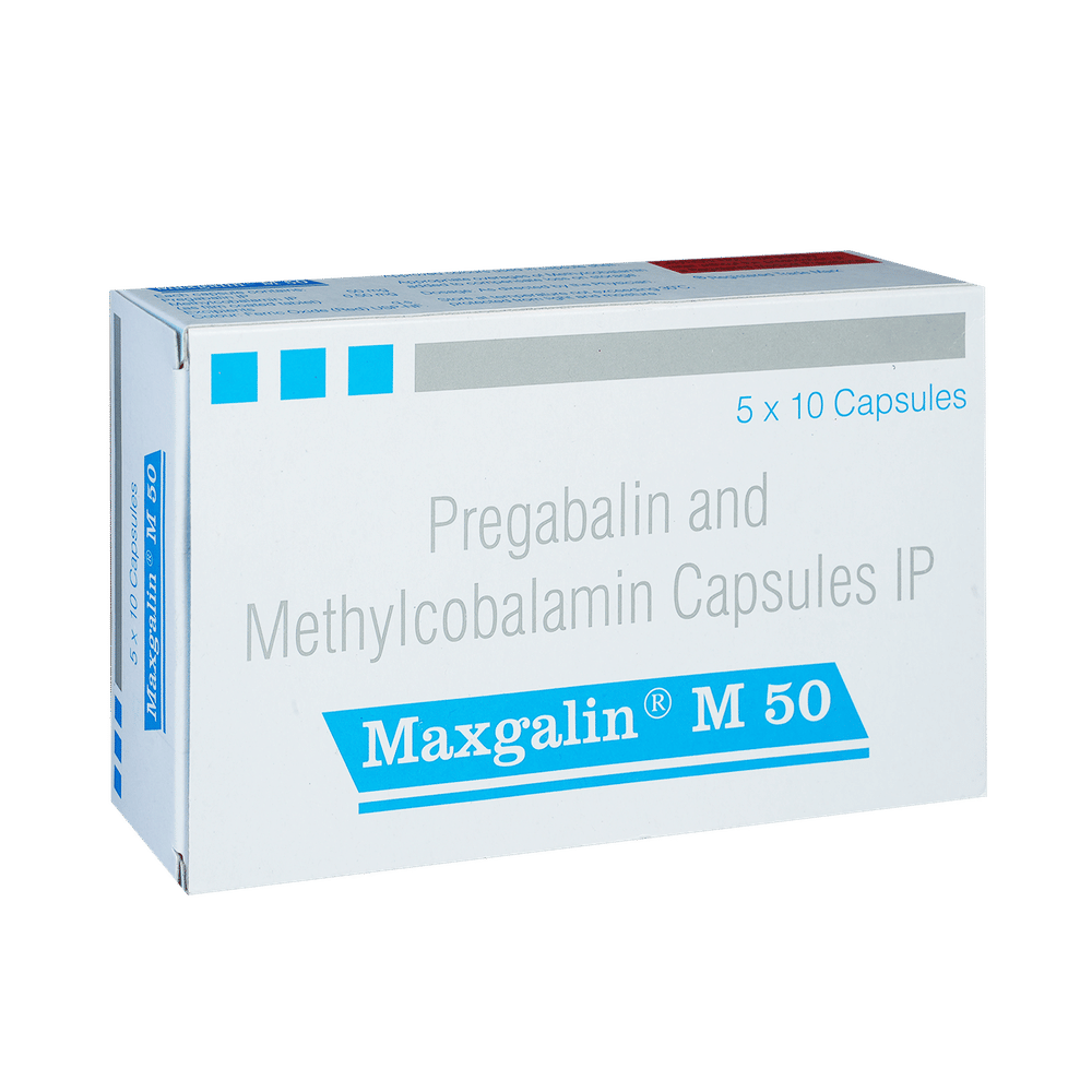 Maxgalin M 50 Capsule is a prescription medicine used for the treatment of neuropathic pain. It decreases pain by modulating the calcium channel activity of the nerve cells. This medicine also protects nerve fibers and heals damaged nerve cells. Maxgalin M 50 Capsule may be taken with or without food, preferably at bedtime. It is advised to take it at the same time each day as this helps to maintain a consistent level of medicine in the body. Take this medicine in the dose and duration advised by your doctor. If you miss a dose of this medicine, take it as soon as you remember. Finish the full course of treatment even if you feel better. This medication must not be stopped suddenly without talking to the doctor.Some common side effects of this medicine include nausea, vomiting, diarrhea, constipation, blurred vision, dizziness, and sleepiness. Do not drive or do anything that requires mental focus until you know how this medicine affects you. The side effects are mild and usually improve with time. It may also cause weight gain in some people. Exercise regularly and have a balanced diet to keep your weight in check. Inform your doctor if you develop any unusual changes in mood or behavior, new or worsening depression, or suicidal thoughts.Your doctor should also know about all other medicines you are taking, as many of these may make this medicine less effective or change the way it works. Inform your doctor if you are pregnant, planning pregnancy, or breastfeeding to make sure it is safe for you and the developing baby.