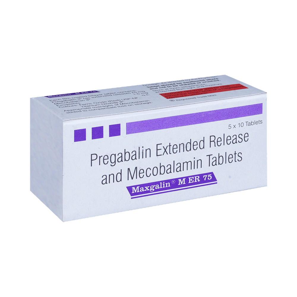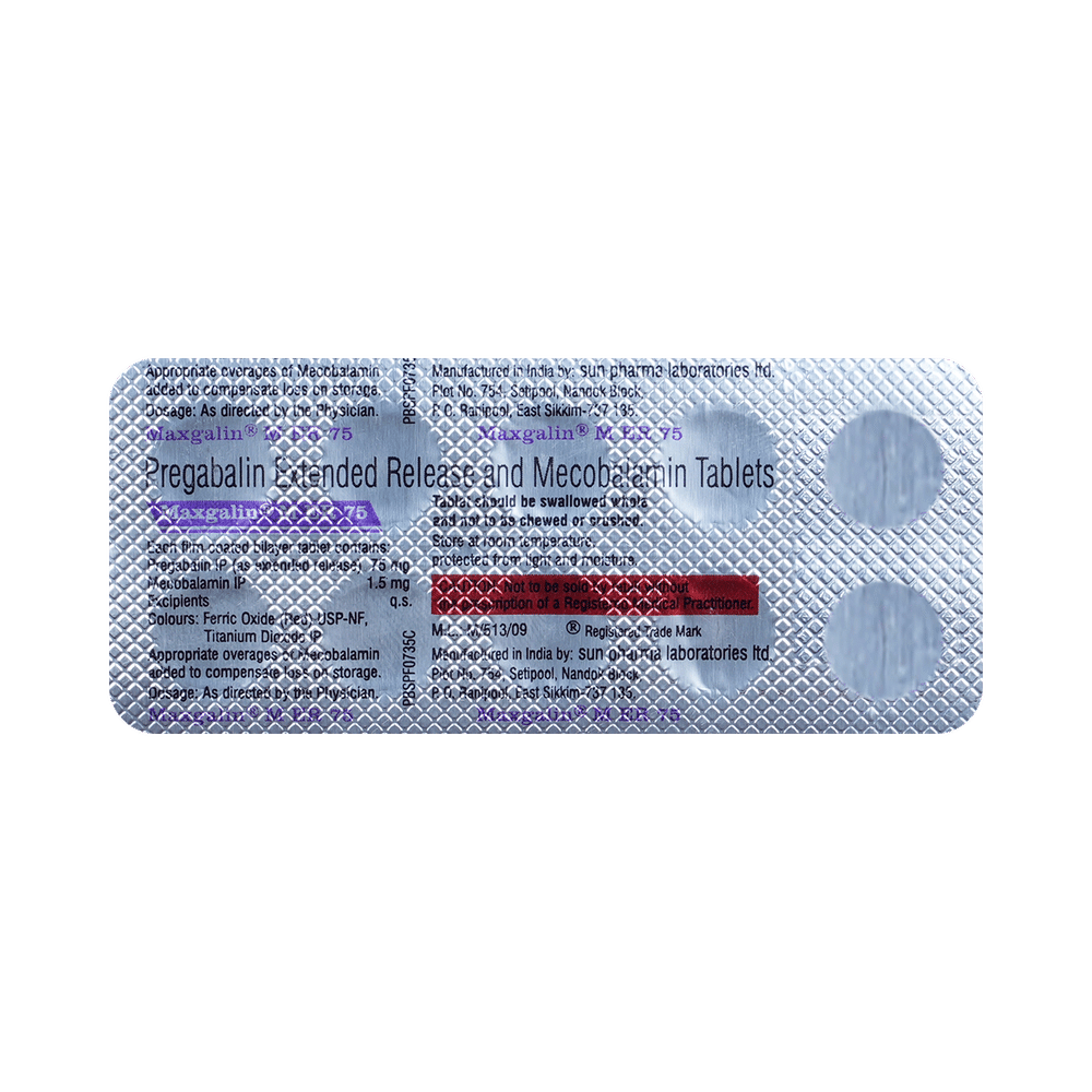 Maxgalin M ER 75 Tablet is a prescription medicine used for the treatment of neuropathic pain. It decreases pain by modulating the calcium channel activity of the nerve cells. This medicine also protects nerve fibers and heals damaged nerve cells. Maxgalin M ER 75 Tablet may be taken with or without food, preferably at bedtime. It is advised to take it at the same time each day as this helps to maintain a consistent level of medicine in the body. Take this medicine in the dose and duration advised by your doctor. If you miss a dose of this medicine, take it as soon as you remember. Finish the full course of treatment even if you feel better. This medication must not be stopped suddenly without talking to the doctor.Some common side effects of this medicine include nausea, vomiting, diarrhea, constipation, blurred vision, dizziness, and sleepiness. Do not drive or do anything that requires mental focus until you know how this medicine affects you. The side effects are mild and usually improve with time. It may also cause weight gain in some people. Exercise regularly and have a balanced diet to keep your weight in check. Inform your doctor if you develop any unusual changes in mood or behavior, new or worsening depression, or suicidal thoughts.Your doctor should also know about all other medicines you are taking, as many of these may make this medicine less effective or change the way it works. Inform your doctor if you are pregnant, planning pregnancy, or breastfeeding to make sure it is safe for you and the developing baby.