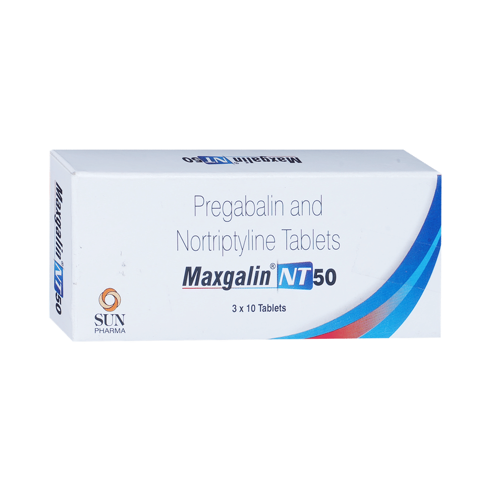 Maxgalin NT 50mg/10mg Tablet is a combination medicine used for the treatment of neuropathic pain. This medicine decreases the pain by stopping the movement of pain signals to the brain. Maxgalin NT 50mg/10mg Tablet may be taken with or without food, preferably at bedtime. Take it at the same time each day as this helps to maintain a consistent level of medicine in the blood. Take this medicine in the dose and duration advised by your doctor. If you miss a dose of this medicine, take it as soon as you remember. Finish the complete course of treatment even if you feel better. Do not stop this medication suddenly without talking to the doctor.Some common side effects of this medicine include constipation, nausea, vision disturbance, and excessive sweating. It may also cause dizziness and sleepiness. So, do not drive or do anything that requires mental focus until you know how this medicine affects you. This medicine may cause weight gain, and to control it, you should exercise regularly and have a balanced diet. It is important to inform your doctor if you develop any unusual changes in mood or behavior, new or worsening depression, or suicidal thoughts.Before taking Maxgalin NT 50mg/10mg Tablet, let your doctor know if you suffer from kidney or liver disease. Your doctor should also know about all other medicines you are taking, as many of these may make this medicine less effective or change the way it works. Inform your doctor if you are pregnant, planning pregnancy, or breastfeeding.