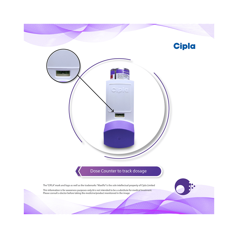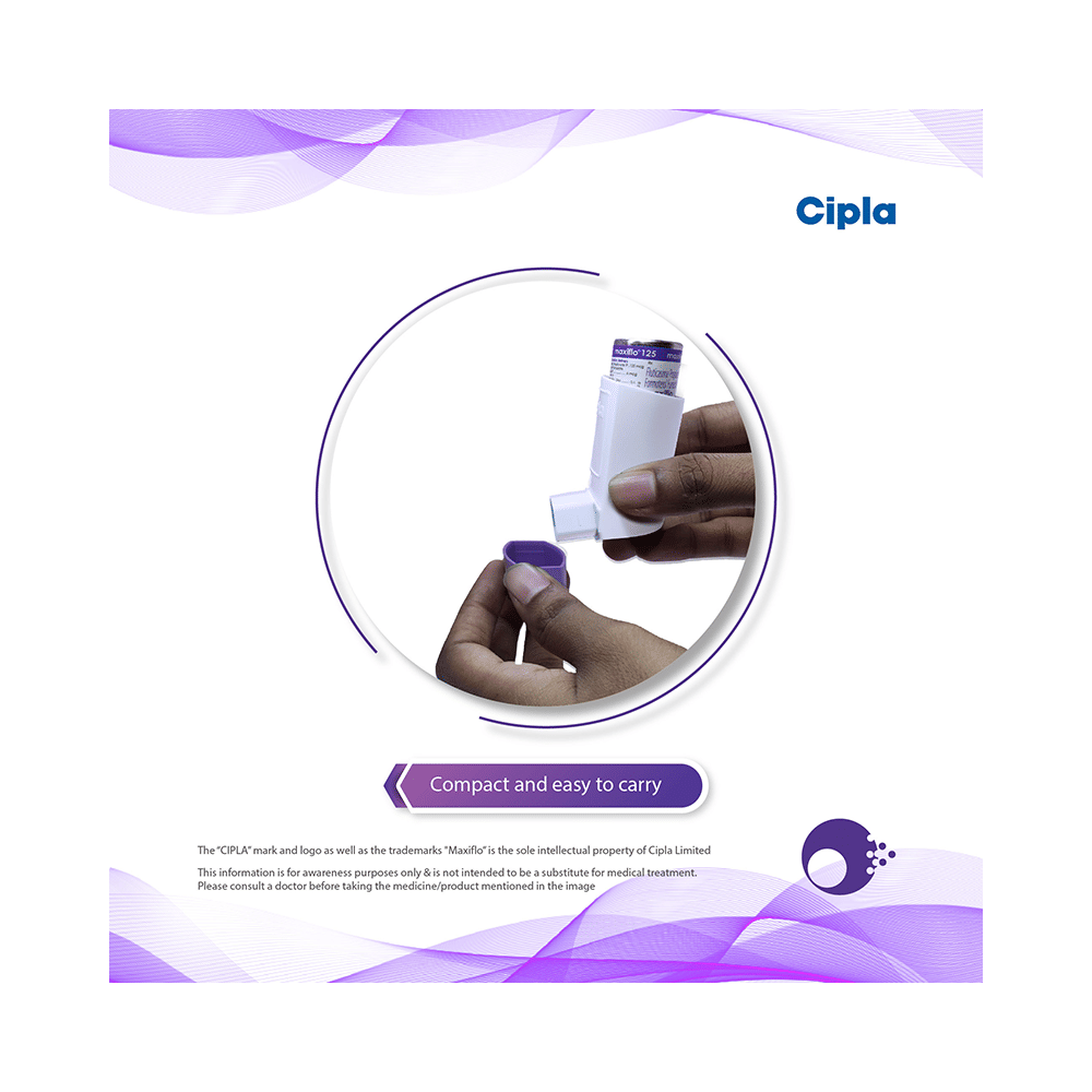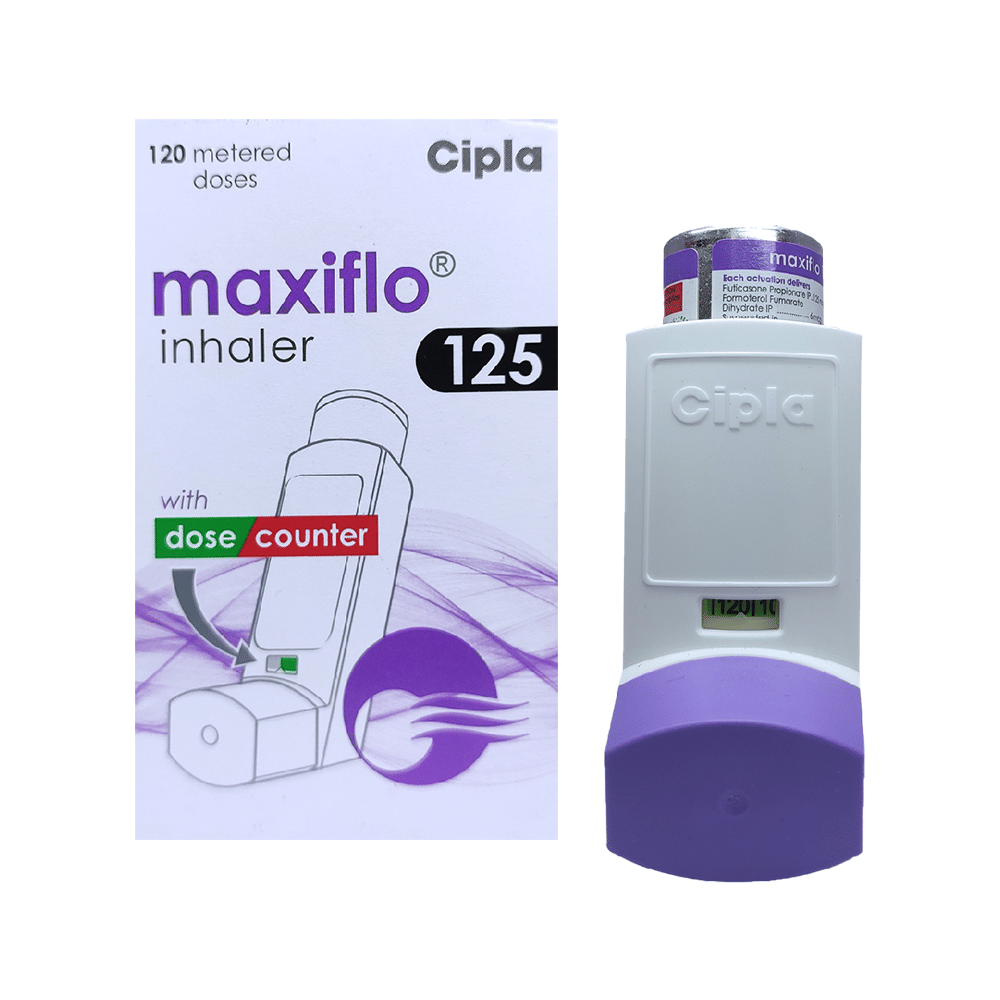 Maxiflo 125 Inhaler is used in the treatment of asthma (wheezing and shortness of breath) and chronic obstructive pulmonary disorder (a lung disorder in which the flow of air to the lungs is blocked). It relaxes the muscles of the air passages and making it easier to breathe. Your doctor will tell you how often you need to use your inhaler. It’s important that you take the lowest dose needed to effectively control your asthma. The effect of this medicine may be noticeable after a few days but will only reach its maximum after a few weeks. This medicine must be used regularly to be effective, so go on taking it even if you don't have any symptoms. That means it’s doing its job. If you stop taking it your asthma and COPD may get worse. It should not be used to relieve sudden asthma attacks. If an asthma attack occurs, use your quick-relief inhaler (reliever). To get the benefit from this medicine you need to make sure you get your inhaler technique right, otherwise, it Does not work as well.The most common side effects are nausea, vomiting, respiratory tract infection, headache, hoarseness of voice, sore throat, cough, musculoskeletal (bone, muscle or joint) pain, and increased heart rate. If you get there, don’t stop taking it but do talk to your doctor. You can help prevent some of these symptoms by rinsing your mouth and throat with water or brushing your teeth after using your inhaler. There are other, rarer side effects which can be serious. Talk to your doctor if you're worried about them. In general, you should be trying to avoid situations that make your asthma worse (your triggers) and try not to smoke.Ask your doctor whether it’s safe to take this medicine if you're pregnant or breastfeeding. Before taking it, you should tell your doctor if you have any kidney or liver diseases so that your doctor can prescribe a suitable dose for you.