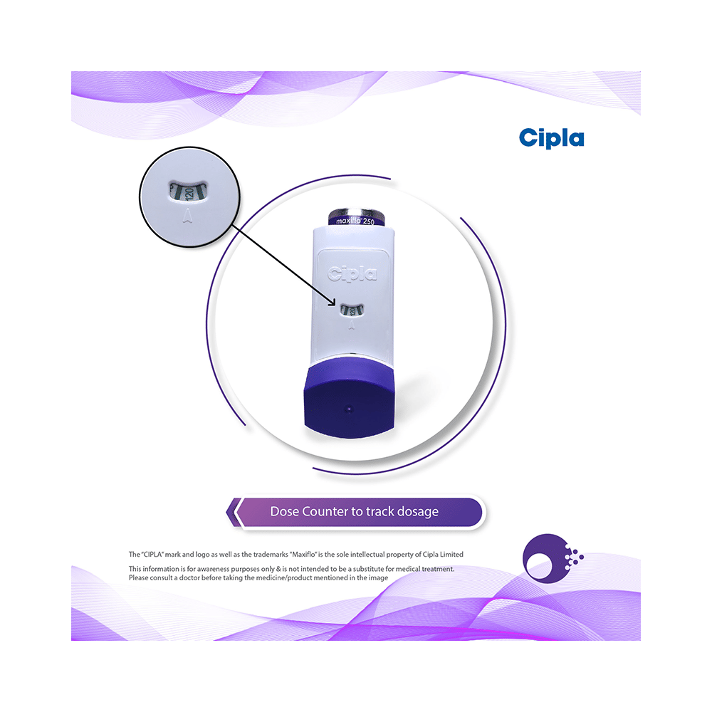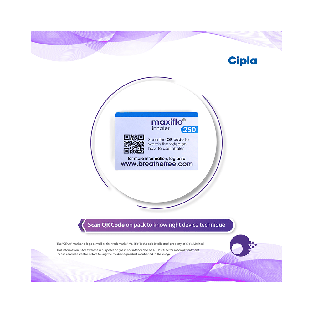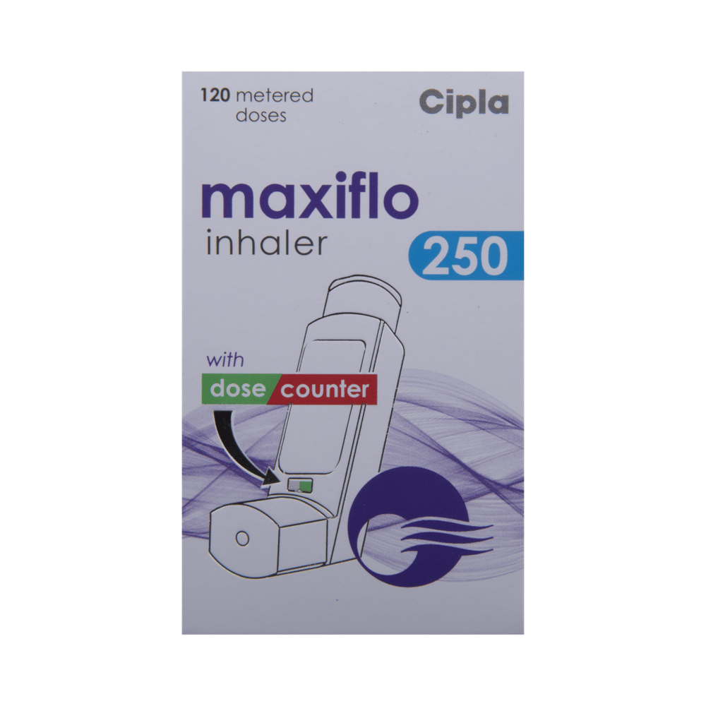 Maxiflo 250 Inhaler is used in the treatment of asthma (wheezing and shortness of breath) and chronic obstructive pulmonary disorder (a lung disorder in which the flow of air to the lungs is blocked). It relaxes the muscles of the air passages and making it easier to breathe. Your doctor will tell you how often you need to use your inhaler. It’s important that you take the lowest dose needed to effectively control your asthma. The effect of this medicine may be noticeable after a few days but will only reach its maximum after a few weeks. This medicine must be used regularly to be effective, so go on taking it even if you don't have any symptoms. That means it’s doing its job. If you stop taking it your asthma and COPD may get worse. It should not be used to relieve sudden asthma attacks. If an asthma attack occurs, use your quick-relief inhaler (reliever). To get the benefit from this medicine you need to make sure you get your inhaler technique right, otherwise, it Does not work as well.The most common side effects are nausea, vomiting, respiratory tract infection, headache, hoarseness of voice, sore throat, cough, musculoskeletal (bone, muscle or joint) pain, and increased heart rate. If you get there, don’t stop taking it but do talk to your doctor. You can help prevent some of these symptoms by rinsing your mouth and throat with water or brushing your teeth after using your inhaler. There are other, rarer side effects which can be serious. Talk to your doctor if you're worried about them. In general, you should be trying to avoid situations that make your asthma worse (your triggers) and try not to smoke.Ask your doctor whether it’s safe to take this medicine if you're pregnant or breastfeeding. Before taking it, you should tell your doctor if you have any kidney or liver diseases so that your doctor can prescribe a suitable dose for you.