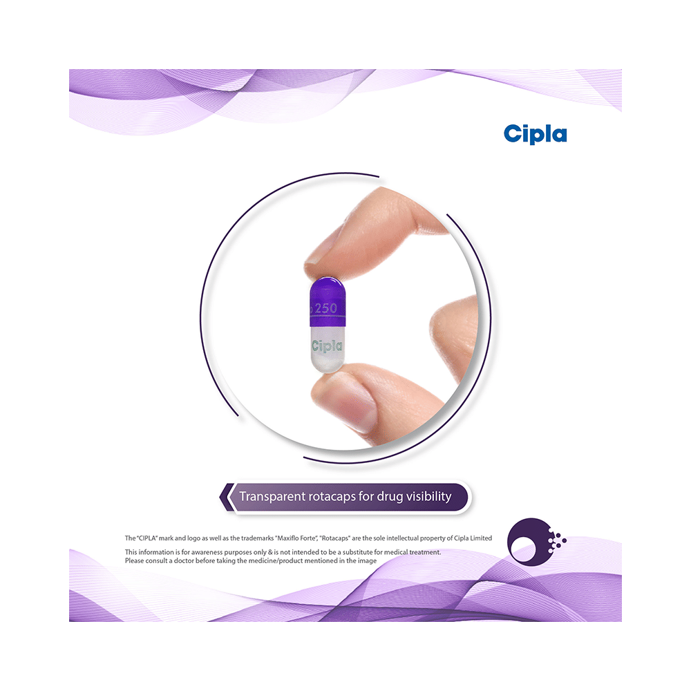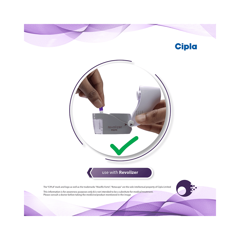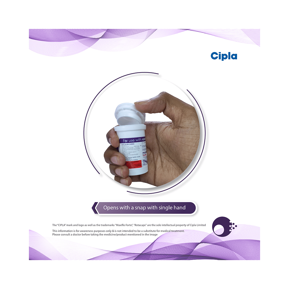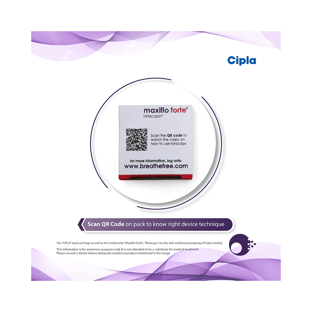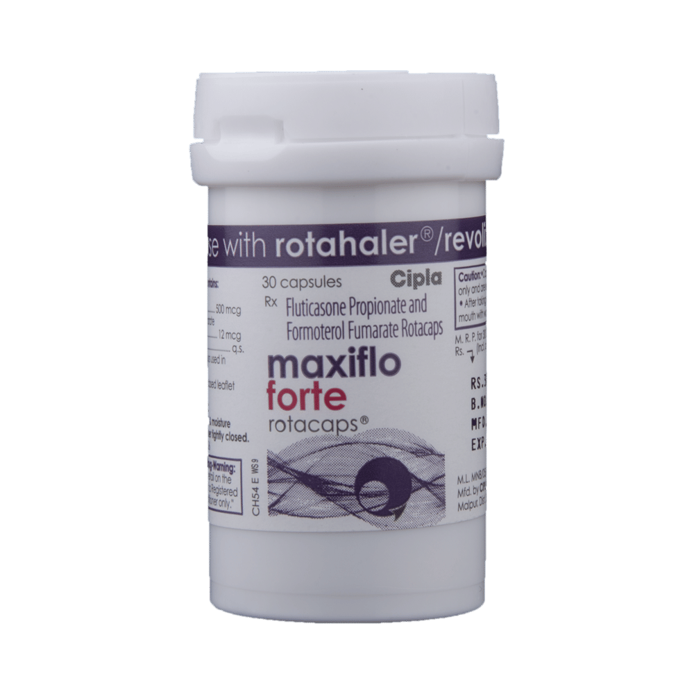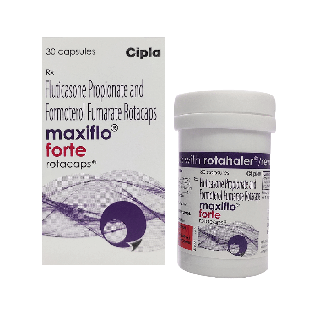 Maxiflo Forte Rotacap is used in the treatment of asthma (wheezing and shortness of breath) and chronic obstructive pulmonary disorder (a lung disorder in which the flow of air to the lungs is blocked). It relaxes the muscles of the air passages and making it easier to breathe. Your doctor will tell you how often you need to use your inhaler. It’s important that you take the lowest dose needed to effectively control your asthma. The effect of this medicine may be noticeable after a few days but will only reach its maximum after a few weeks. This medicine must be used regularly to be effective, so go on taking it even if you don't have any symptoms. That means it’s doing its job. If you stop taking it your asthma and COPD may get worse. It should not be used to relieve sudden asthma attacks. If an asthma attack occurs, use your quick-relief inhaler (reliever). To get the benefit from this medicine you need to make sure you get your inhaler technique right, otherwise, it Does not work as well.The most common side effects are nausea, vomiting, respiratory tract infection, headache, hoarseness of voice, sore throat, cough, musculoskeletal (bone, muscle or joint) pain, and increased heart rate. If you get there, don’t stop taking it but do talk to your doctor. You can help prevent some of these symptoms by rinsing your mouth and throat with water or brushing your teeth after using your inhaler. There are other, rarer side effects which can be serious. Talk to your doctor if you're worried about them. In general, you should be trying to avoid situations that make your asthma worse (your triggers) and try not to smoke.Ask your doctor whether it’s safe to take this medicine if you're pregnant or breastfeeding. Before taking it, you should tell your doctor if you have any kidney or liver diseases so that your doctor can prescribe a suitable dose for you.