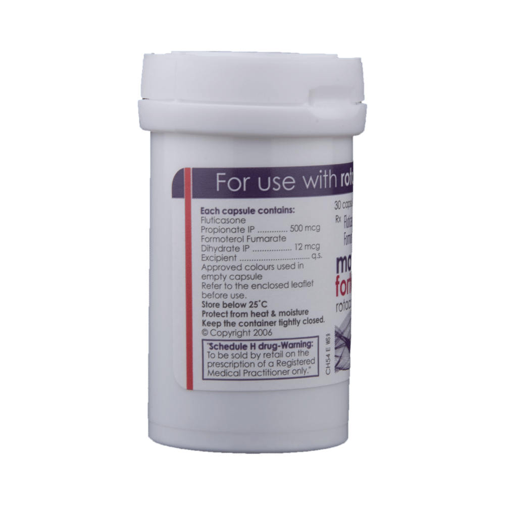 Maxiflo Forte Rotacap is a combination of two medicines: Formoterol and Fluticasone Propionate. Formoterol is a long-acting bronchodilator which works by relaxing the muscles in the airways and widens the airways. Fluticasone Propionate is a steroid. It works by stopping the release of certain chemical messengers that cause inflammation (swelling) of the airways. Together, they make breathing easier.
