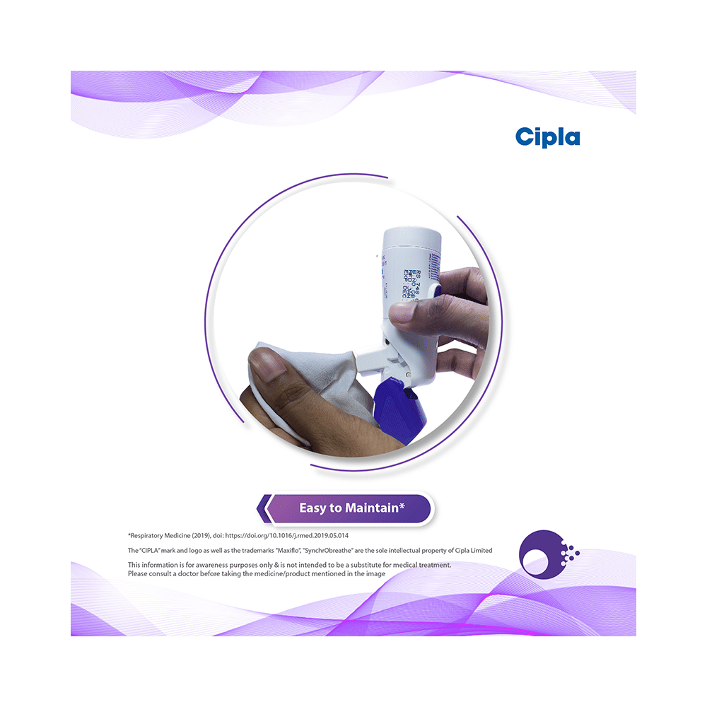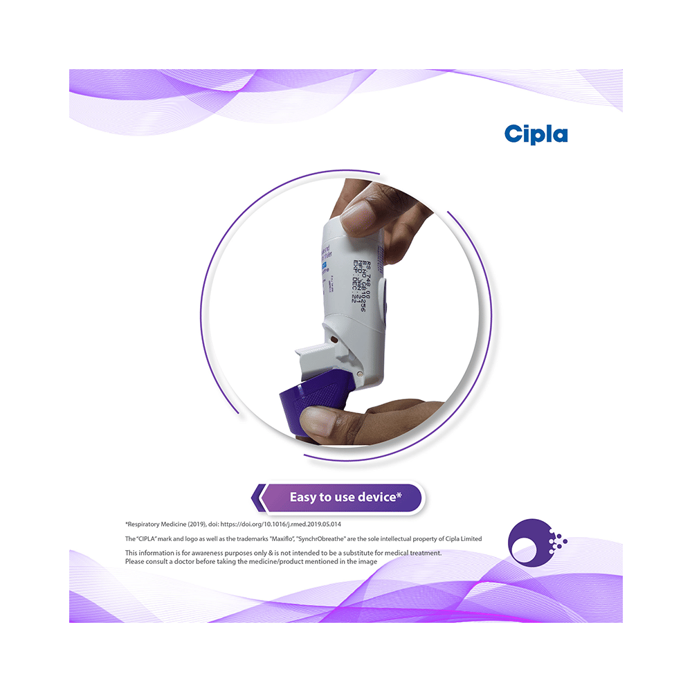 In Treatment of Chronic obstructive pulmonary disease (COPD)Maxiflo Synchrobreathe 6mcg/250mcg Inhaler helps the lungs’ airways to stay open. It relaxes the muscles of these airways, making it easier for the air to get in and out. It relieves COPD symptoms, such as tightness in chest, shortness of breath, wheezing, and coughing, and helps you carry out daily activities more easily. This medicine is safe and effective. It usually starts to work within a few minutes and the effects can last up to several hours. Do not stop using it unless the doctor advises you.