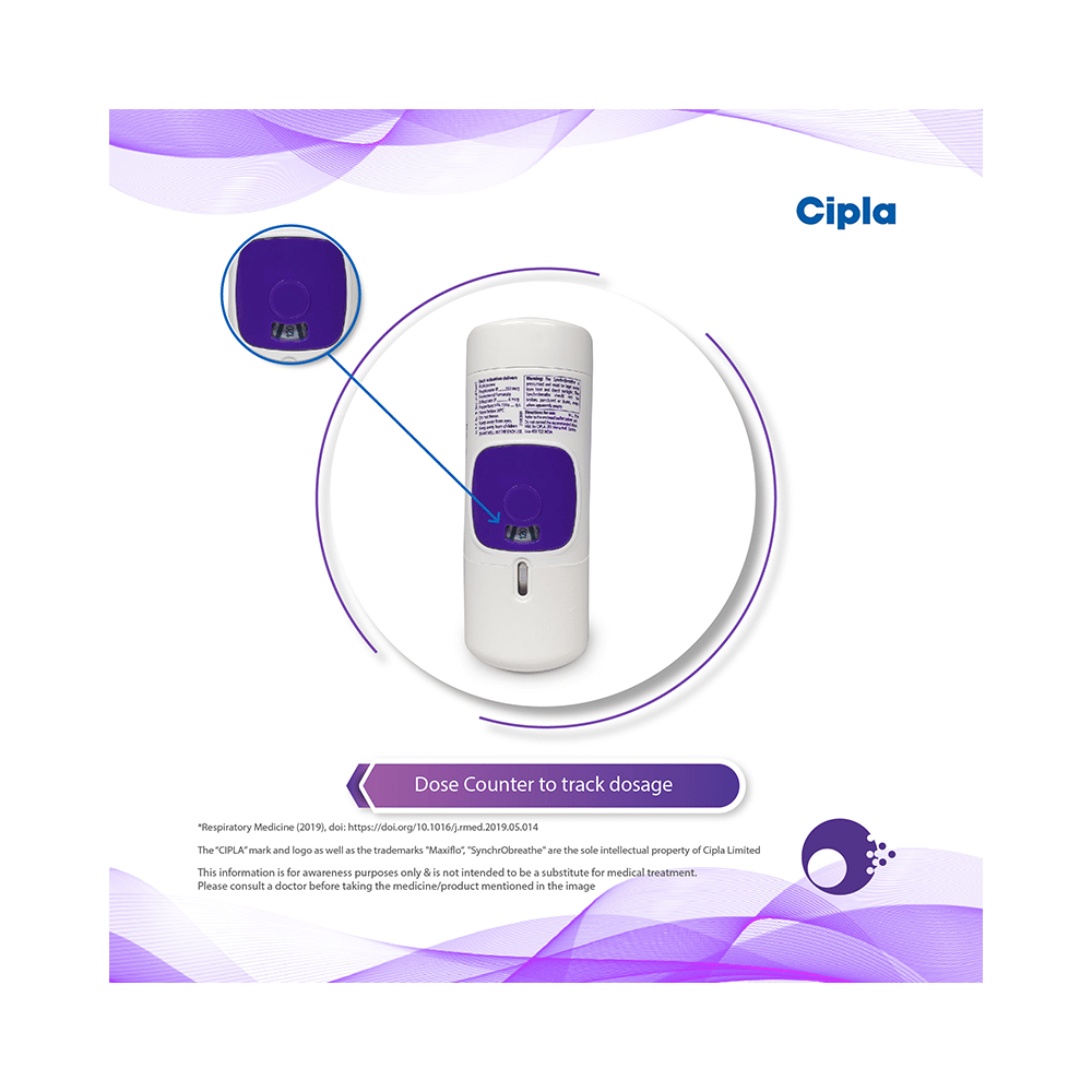Maxiflo Synchrobreathe 6mcg/250mcg Inhaler is used in the treatment of asthma (wheezing and shortness of breath) and chronic obstructive pulmonary disorder (a lung disorder in which the flow of air to the lungs is blocked). It relaxes the muscles of the air passages and making it easier to breathe. Your doctor will tell you how often you need to use your inhaler. It’s important that you take the lowest dose needed to effectively control your asthma. The effect of this medicine may be noticeable after a few days but will only reach its maximum after a few weeks. This medicine must be used regularly to be effective, so go on taking it even if you don't have any symptoms. That means it’s doing its job. If you stop taking it your asthma and COPD may get worse. It should not be used to relieve sudden asthma attacks. If an asthma attack occurs, use your quick-relief inhaler (reliever). To get the benefit from this medicine you need to make sure you get your inhaler technique right, otherwise, it Does not work as well.The most common side effects are nausea, vomiting, respiratory tract infection, headache, hoarseness of voice, sore throat, cough, musculoskeletal (bone, muscle or joint) pain, and increased heart rate. If you get there, don’t stop taking it but do talk to your doctor. You can help prevent some of these symptoms by rinsing your mouth and throat with water or brushing your teeth after using your inhaler. There are other, rarer side effects which can be serious. Talk to your doctor if you're worried about them. In general, you should be trying to avoid situations that make your asthma worse (your triggers) and try not to smoke.Ask your doctor whether it’s safe to take this medicine if you're pregnant or breastfeeding. Before taking it, you should tell your doctor if you have any kidney or liver diseases so that your doctor can prescribe a suitable dose for you.