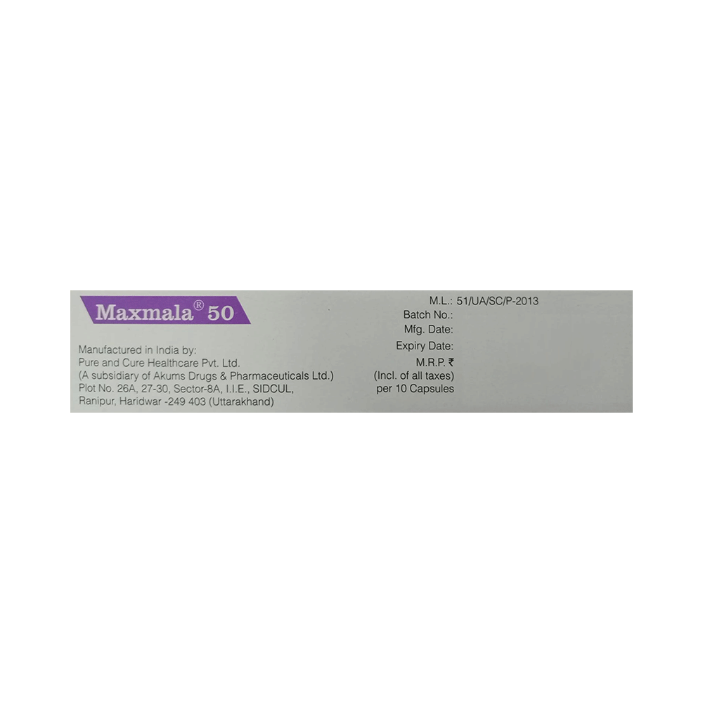 If you miss a dose of Maxmala 50 Capsule, take it as soon as possible. However, if it is almost time for your next dose, skip the missed dose and go back to your regular schedule. Do not double the dose.