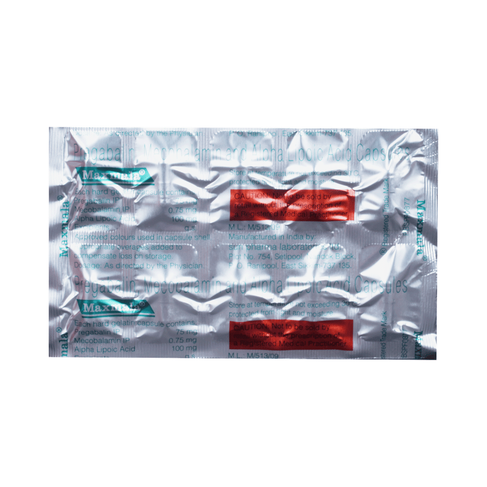 Maxmala Capsule is a combination of three medicines: Pregabalin, Methylcobalamin and Alpha Lipoic Acid. Pregabalin is an alpha 2 delta ligand which decreases pain by modulating calcium channel activity of the nerve cells. Methylcobalamin is a form of vitamin B which helps in the production of myelin, a substance that protects nerve fibers and rejuvenates damaged nerve cells. Alpha Lipoic Acid is a naturally occurring fatty acid which has a protective effect on brain and nerve tissue. Together, they relieve neuropathic pain (pain from damaged nerves).