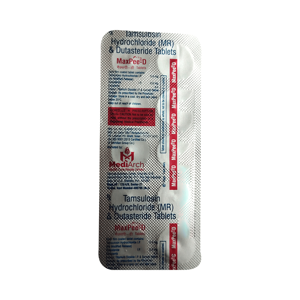 In Treatment of Benign prostatic hyperplasiaWhen your prostate gland becomes enlarged it can cause urinary problems such as difficulty passing urine and a need to go to the toilet frequently or urgently. It can also cause urine flow to be slower. If not treated, there is a risk that your urine flow will be completely blocked. Maxpee D Tablet MR is a combination of two medicines: dutasteride and tamsulosin. Dutasteride reduces the size of your prostate by blocking the production of a hormone which causes it to grow. Tamsulosin works by relaxing muscles in the bladder and prostate. Together they can rapidly relieve the symptoms and make it easier for you to urinate. However, it may take up to 6 months to notice the full benefit. Take this medicine exactly as prescribed for maximum benefits.