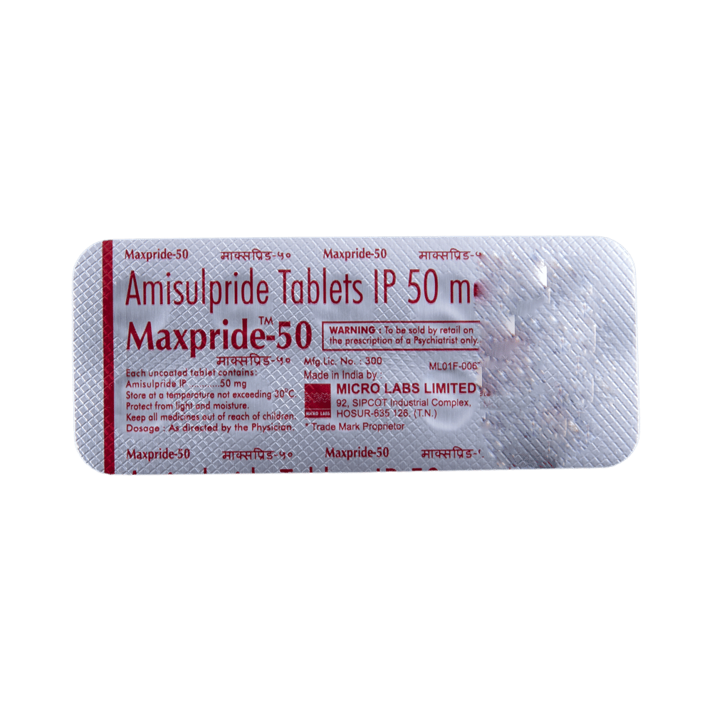 Maxpride 50 Tablet is an atypical antipsychotic. It works by modulating the action of certain chemical messengers in the brain that affect thoughts.